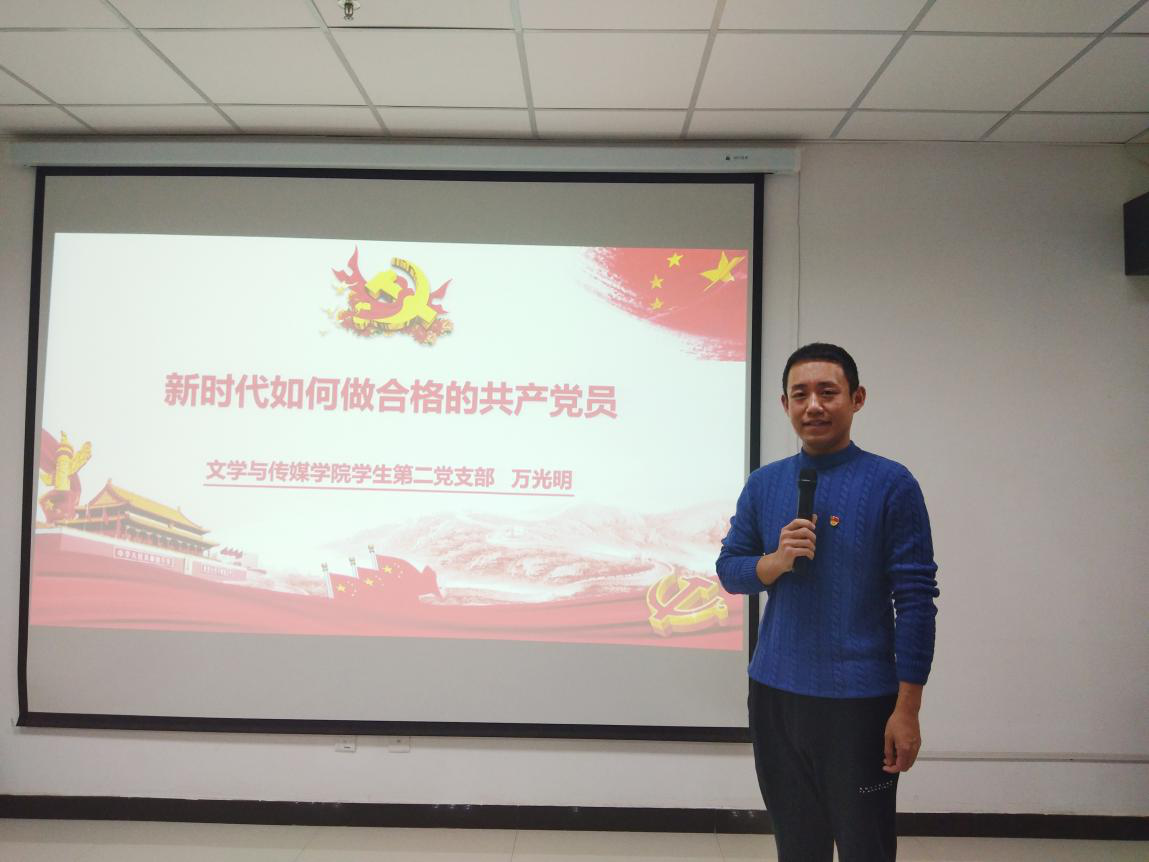 12月12日下午,我院学生第二党支部在文科综合楼1417办公室举办了以“新时代如何做合格的共产党员”为主题的党课活动。学生第二党支部全体成员参加了本次党课,主讲人为学生第二党支部书记万光明。