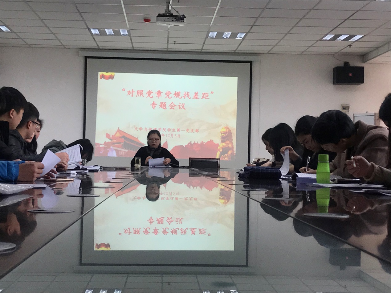 12月5日,我院学生第一党支部在1417会议室召开对照党章党规找差距专题会议。会议由党支部书记张姗姗主持,由全体学生第一党支部党员参加。