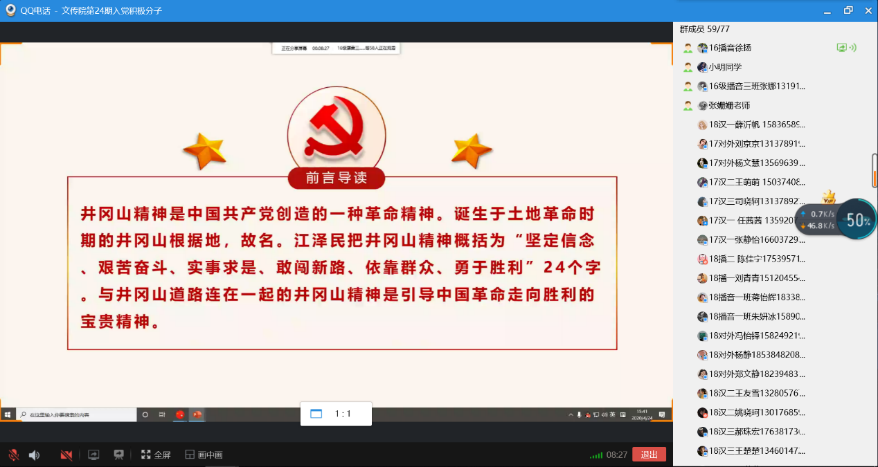 4月24日下午,我院进行第24期分党课的网络培训,本次培训由学生党员代表徐扬、廖雨泉作为主讲人带领学员们学习领悟井冈山精神和西柏坡精神。