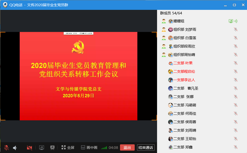 为进一步规范党员组织关系转接工作程序,切实做好我院2020届毕业生党员教育管理和组织关系转移工作,5月29日下午,我院毕业生党员教育管理和组织关系转接工作会议以线上形式召开,会议由我院组织员张姗姗老师主持。