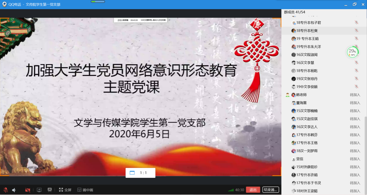 2020年6月5日,我院学生第一党支部通过网络开展了“加强大学生党员网络意识形态教育”主题党课。党课由支部书记张姗姗主讲,全体支部学生党员参加。