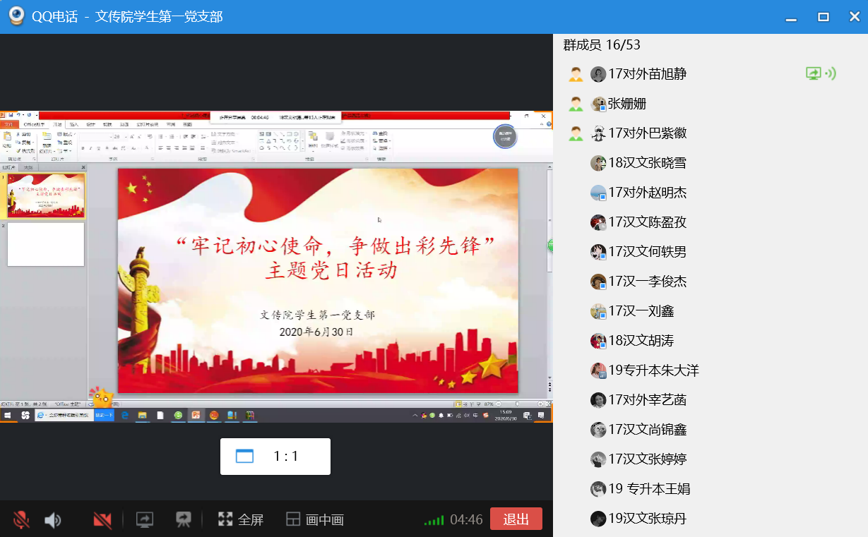 为庆祝中国共产党建党99周年,缅怀革命英烈,牢记入党初心,在七一建党节来临之际,6月30日下午,我院学生第一党支部利用网络召开“牢记初心使命,争当出彩先锋”主题党日活动。本次活动由学生第一党支部书记张姗姗主持,全体学生党员参加。