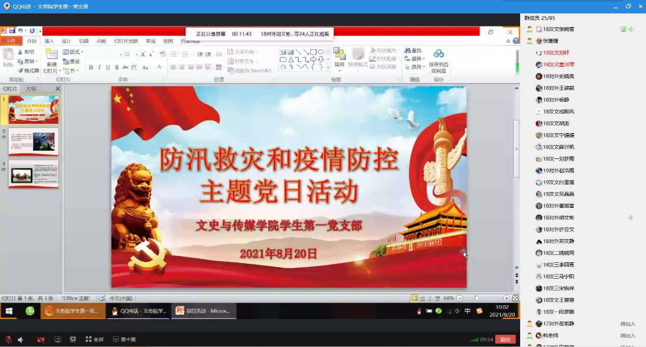 近期,为切实发挥党支部和党员在防汛救灾和疫情防控中的战斗堡垒作用和先锋模范作用,我院学生第一、第二、第三和第四党支部分别召开了“把灾难当教材,与祖国共成长”线上主题党日活动。
