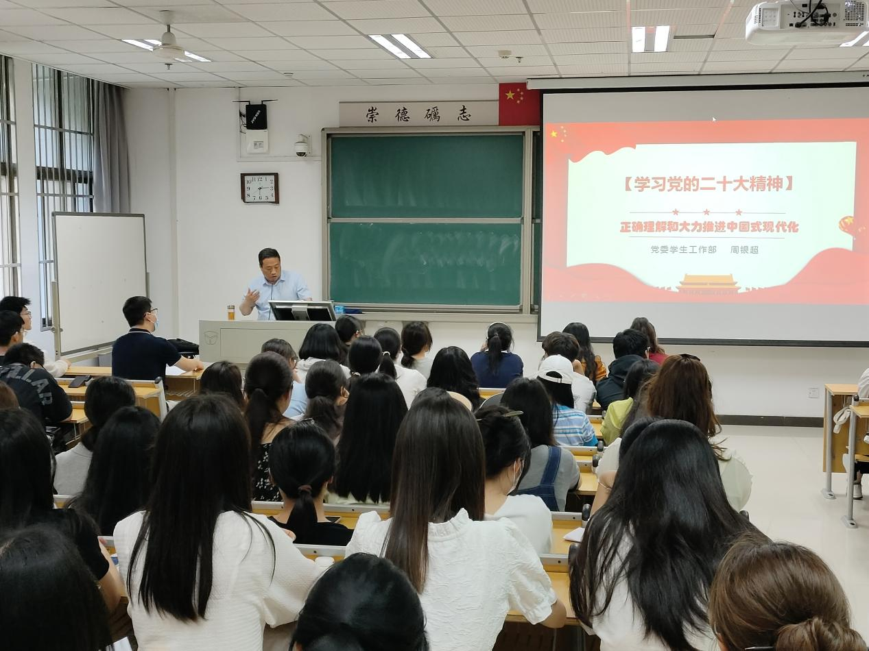 为全面深入学习领会党的二十大精神,2023年6月1日,我院邀请许昌学院党委学工部部长周银超为22级学生上党课。党课主题为正确理解和大力推进中国式现代化。