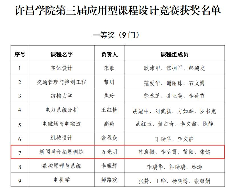 近日,由许昌学院教务处(教学质量监测与评估中心)主办的许昌学院第三届应用型课程设计竞赛落下帷幕,我院播音与主持艺术专业教师万光明荣获一等奖。