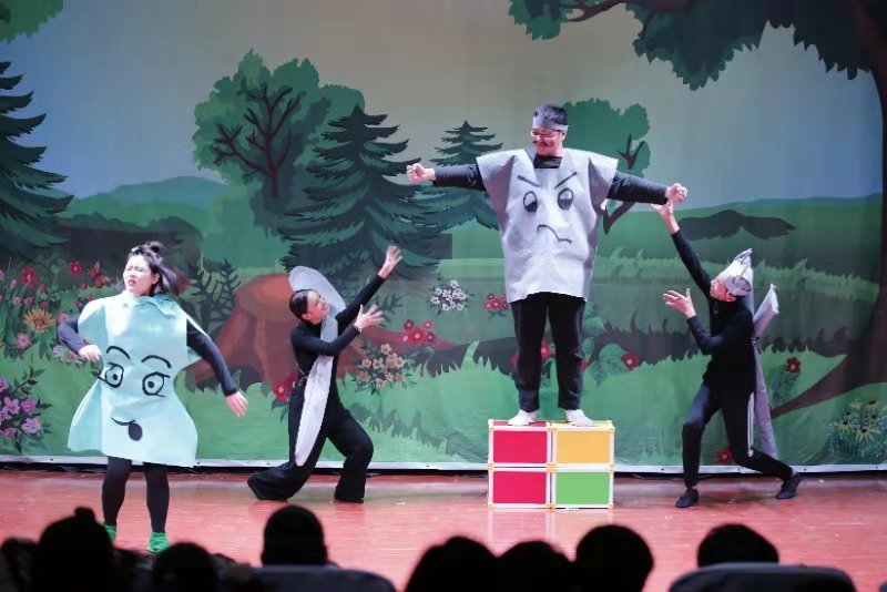 本次演出在诗词改编而成的《小儿垂钓》一剧中拉开帷幕,共包含了《狼来了》、《守株待兔》、《狐假虎威》、《陶罐与铁罐》等五个各具特色的剧目。其中,《小儿垂钓》作为唯一一部改编自古诗的剧目,以丰富的想象消弭了简练诗文带给孩子们的枯燥感和晦涩感,使其从表演伊始便能抓住孩子们的眼球,鼓励班内学生,以及观看表演的孩子们发挥自己的想象力。《狼来了》、《守株待兔》则在原有寓言故事的基础上,增添了许多搞笑元素与现代元素,使这些故事与孩子们的生活联系起来,更容易为孩子们所感知。以大学生特有的创造力,在为观众带来愉悦观感的同时,寓教于乐,用孩子们喜闻乐见的方式,传递了本次“为爱而行”课本剧的教育内涵。而同样由寓言故事改编而来的《狐假虎威》、《陶罐与铁罐》,则加入了更多歌舞、专业方面的内容,既不忘编剧表演教学实验班为教给学生们更多专业学习机会的创立初心,也向孩子们展现了我院的专业性,有助于提高学生对于戏剧艺术、以及各项语言协作能力,帮助其通过更有趣味性、更能为他们所接受的方式,树立正确价值观与道德观。