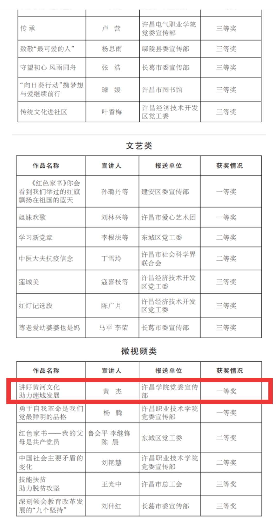近日,由许昌市委宣传部主办、许昌广播电视台承办的许昌市“党的创新理论进基层”宣讲大赛决赛在许昌电视台举行。我院教师黄杰的作品《讲好黄河文化 助力莲城发展》获大赛微视频类一等奖。