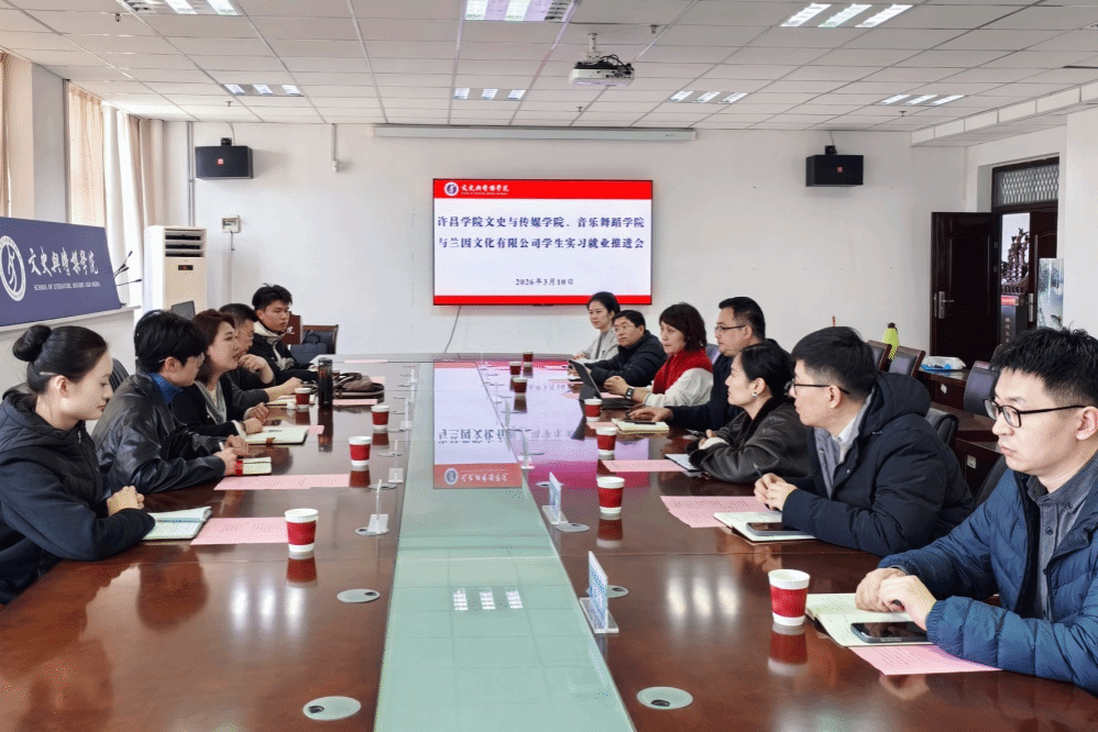 2026年3月10日下午,河南兰因文化传媒有限公司(万岁山运营公司)到校与我院、音乐舞蹈学院共商学生实习就业工作。我院领导尤建设、訾冉、韩启振,音乐舞蹈学院院领导纪明明、王茹等参加会议。河南兰因文化传媒总经理米倩携管理团队一行5人到会。河南工业大学新闻与传播学院派代表参会。会议在文科综合楼1723会议室召开,围绕我院与河南兰因文化传媒前期合作成效,与音乐舞蹈学院、河南工业大学新闻与传播学院启动实习就业等事项展开。