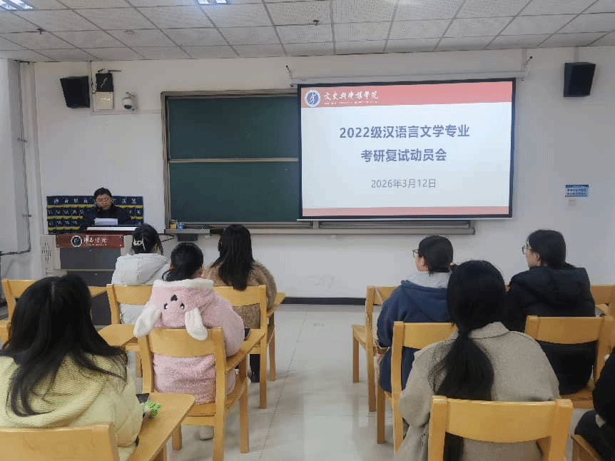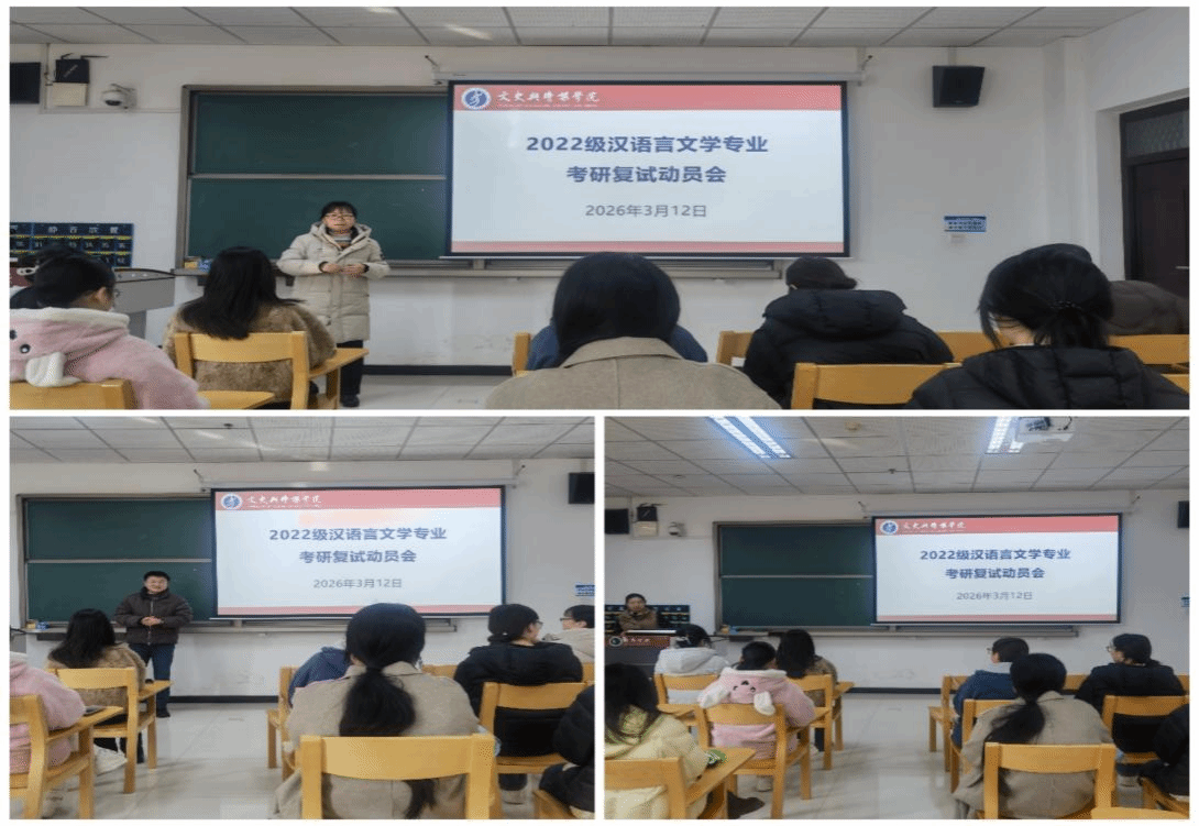 2026年3月12日,我院在文综楼302教室召开2022汉语言文学专业级学生考研复试动员会,旨在精准助力2022级汉语言文学专业的学生备战考研复试,明确冲刺方向,提振备考信心。我院副院长韩启振、汉语言文学系副主任王晓敏、教工第一党支部书记席新蕾、汉语言文学系博士毛民生出席会议,2022级全体入围复试学生参加了本次会议。