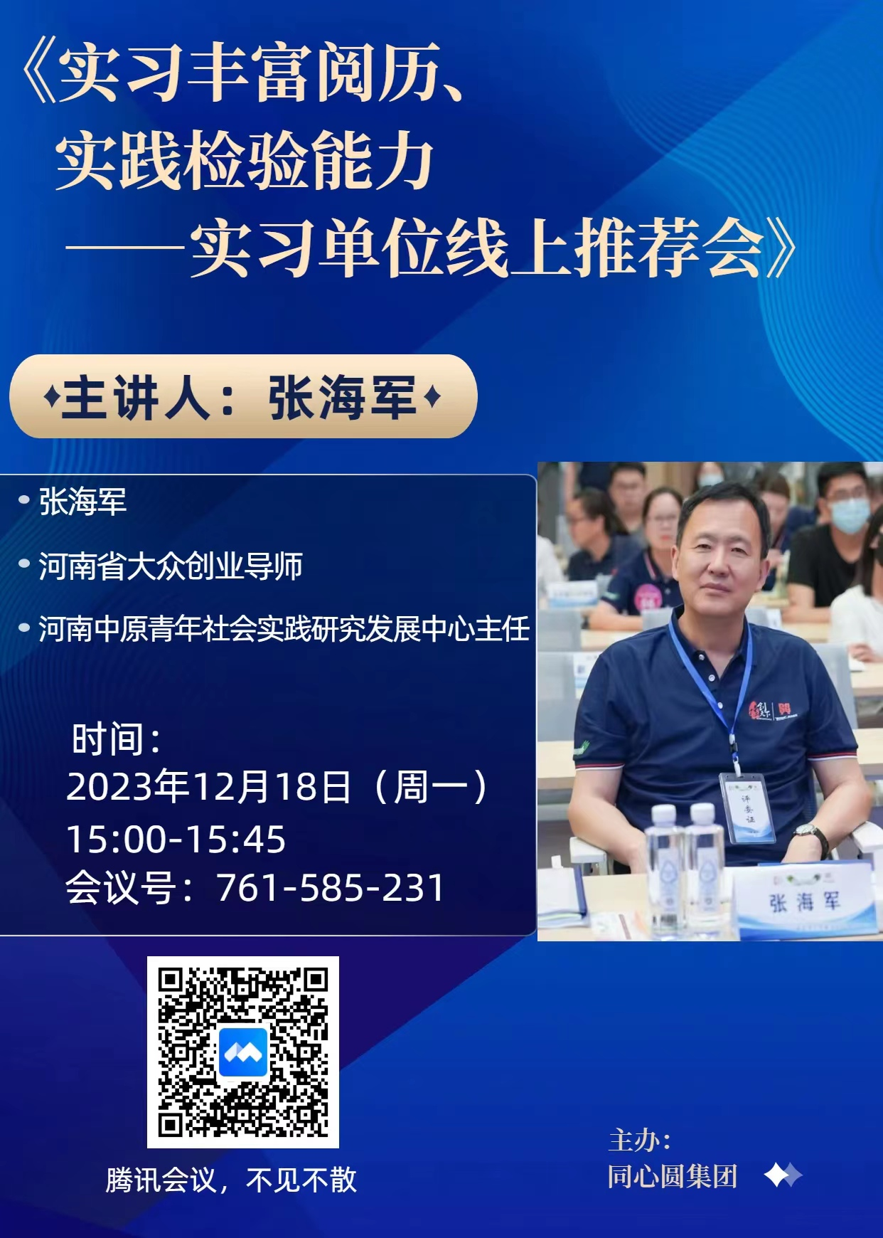 12月18日下午,文史与传媒学院与同心圆集团联合主办的实习就业单位线上推荐会在腾讯会议线上召开,由河南省大众创业导师张海军主讲,文史与传媒学院2024届部分毕业生线上参加了本次会议。