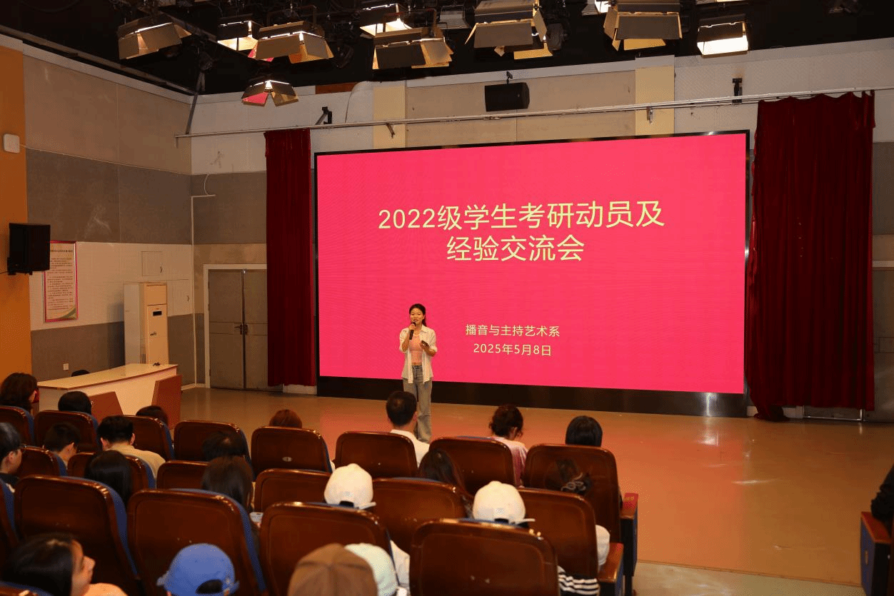2025年5月8日,我院2021级播音与主持艺术专业张彤同学在B合七演播厅为2022级播音与主持艺术专业的同学们带来一场干货满满的考研经验分享会。张彤同学以总分379分(政治58、英语56、专业课133/132)成功考取成都理工大学有声语言艺术方向研究生,她毫无保留地分享自己的考研历程与宝贵经验,助力学弟学妹们的考研之路。