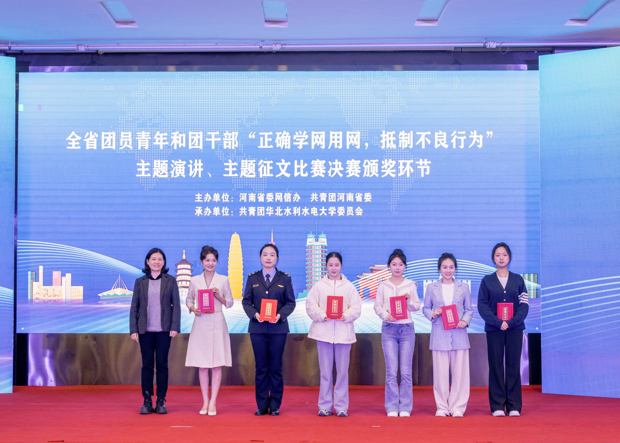 2025年11月13日,由河南省委网信办、共青团河南省委主办,共青团华北水利水电大学委员会承办的“全省团员青年和团干部正确学网用网,抵制不良行为”主题演讲比赛决赛在郑州华北水利水电大学第一学术报告厅圆满落幕。我院24级播音与主持艺术专业学生赵彤凭借扎实的专业素质斩获一等奖。