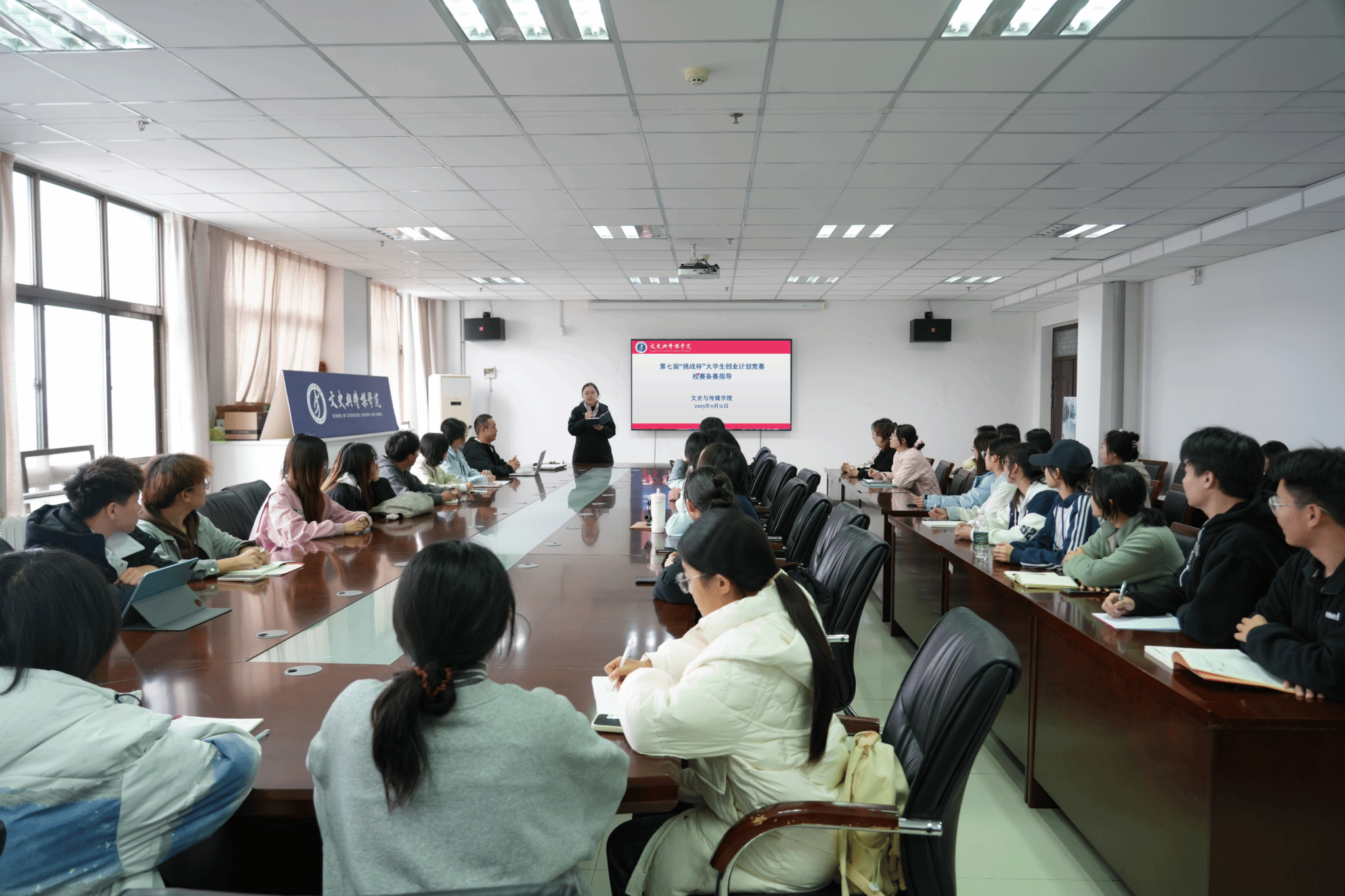 2025年11月12日,我院第七届“挑战杯”大学生创业计划竞赛备赛指导会在文科综合楼1723会议室举行。此次备赛指导由我院团委书记张姗姗老师主讲,为正在准备“挑战杯”各项目的同学指点迷津,帮助同学们有效备赛。