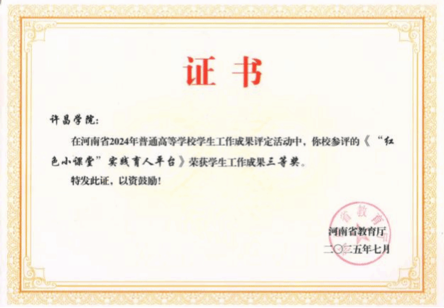 近日,河南省教育厅公布2024年普通高等学校学生工作成果评定结果,我院“红色小课堂”实践育人平台凭借鲜明的育人特色与突出的工作成效,荣获实践服务育人类别三等奖。