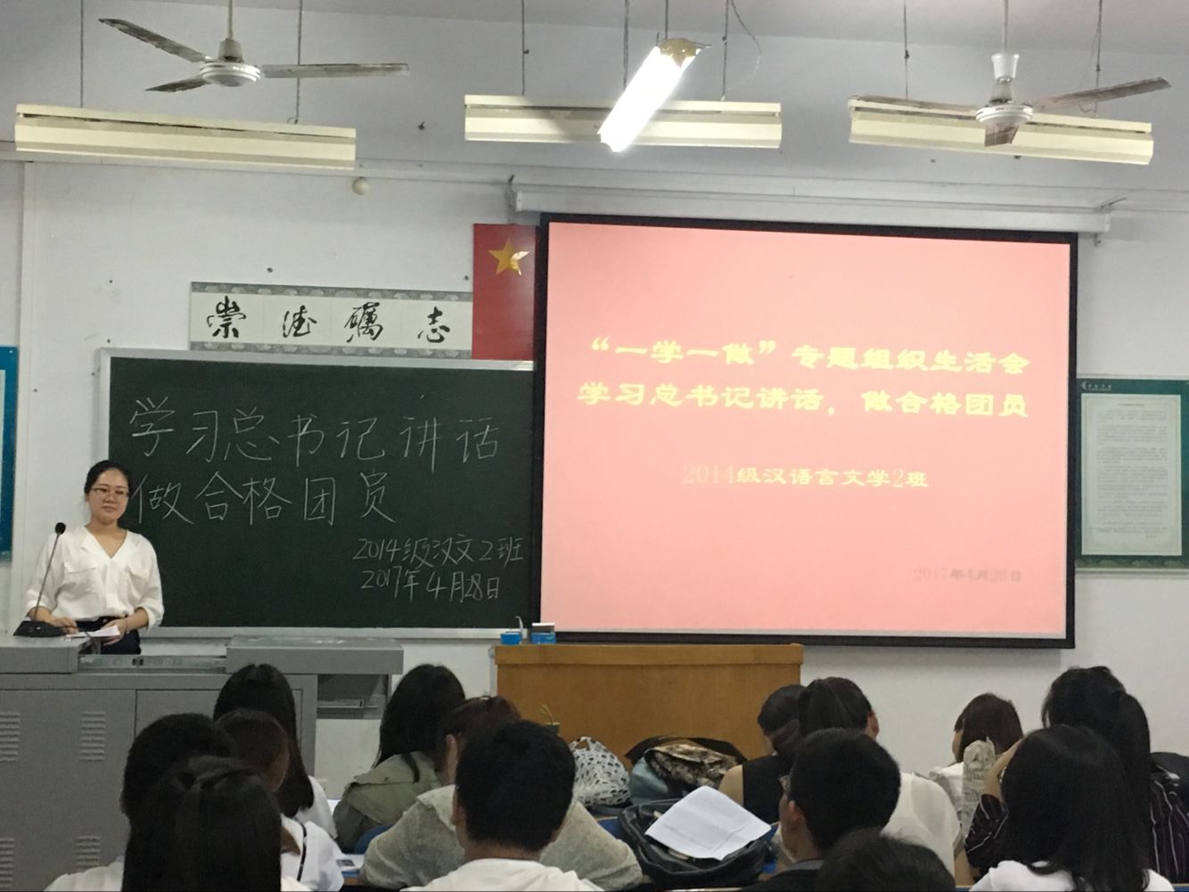 为贯彻学习习近平总书记系列重要讲话精神和治国理政新理念,深入推进共青团组织改革,切实增强团员的先进性和光荣感。4月28日上午,我院14级汉语言文学二班开展了以“中原更出彩,青春正飞扬——怎样做一名合格团员”为主题的团学活动。活动由14级汉语言文学二班团支书主持,全体同学共同参加了此次活动。