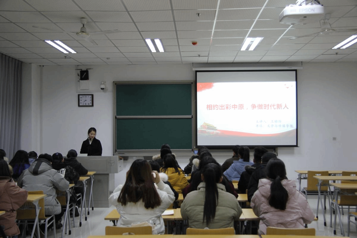 12月26日晚,文学与传媒学院在文综楼408教室开展了“青年大学习”团干讲团课活动。我院学生团总支副书记王昭怡以“相约出彩中原,争做时代新人”为主题,为部分学生干部上了一节生动精彩的团课。