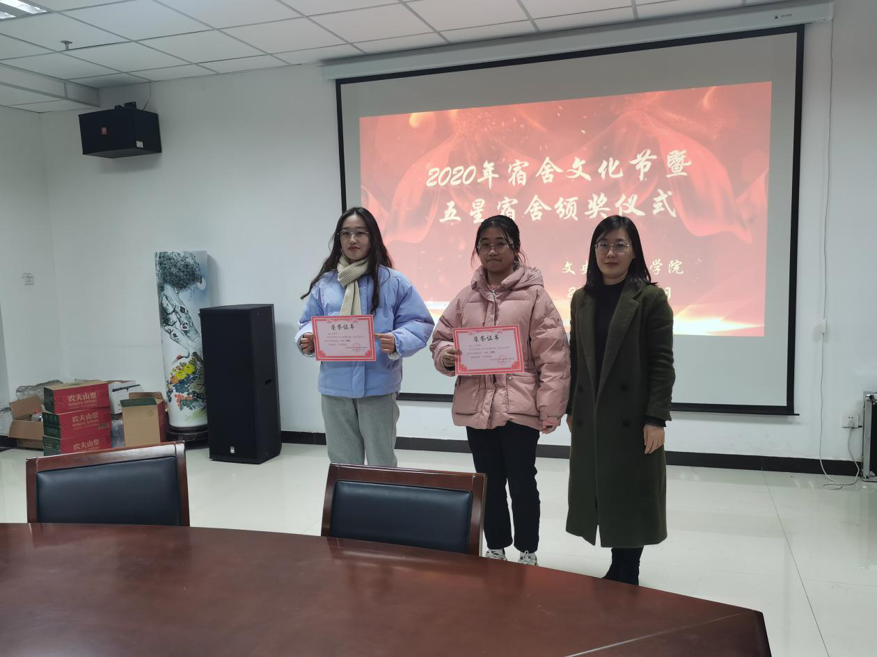 12月15日下午,我院在文综楼1417会议室举行2020年宿舍文化节暨五星宿舍颁奖仪式。文史与传媒学院党委副书记马丽娜、团委书记訾冉及我院各专业辅导员参加本次活动。