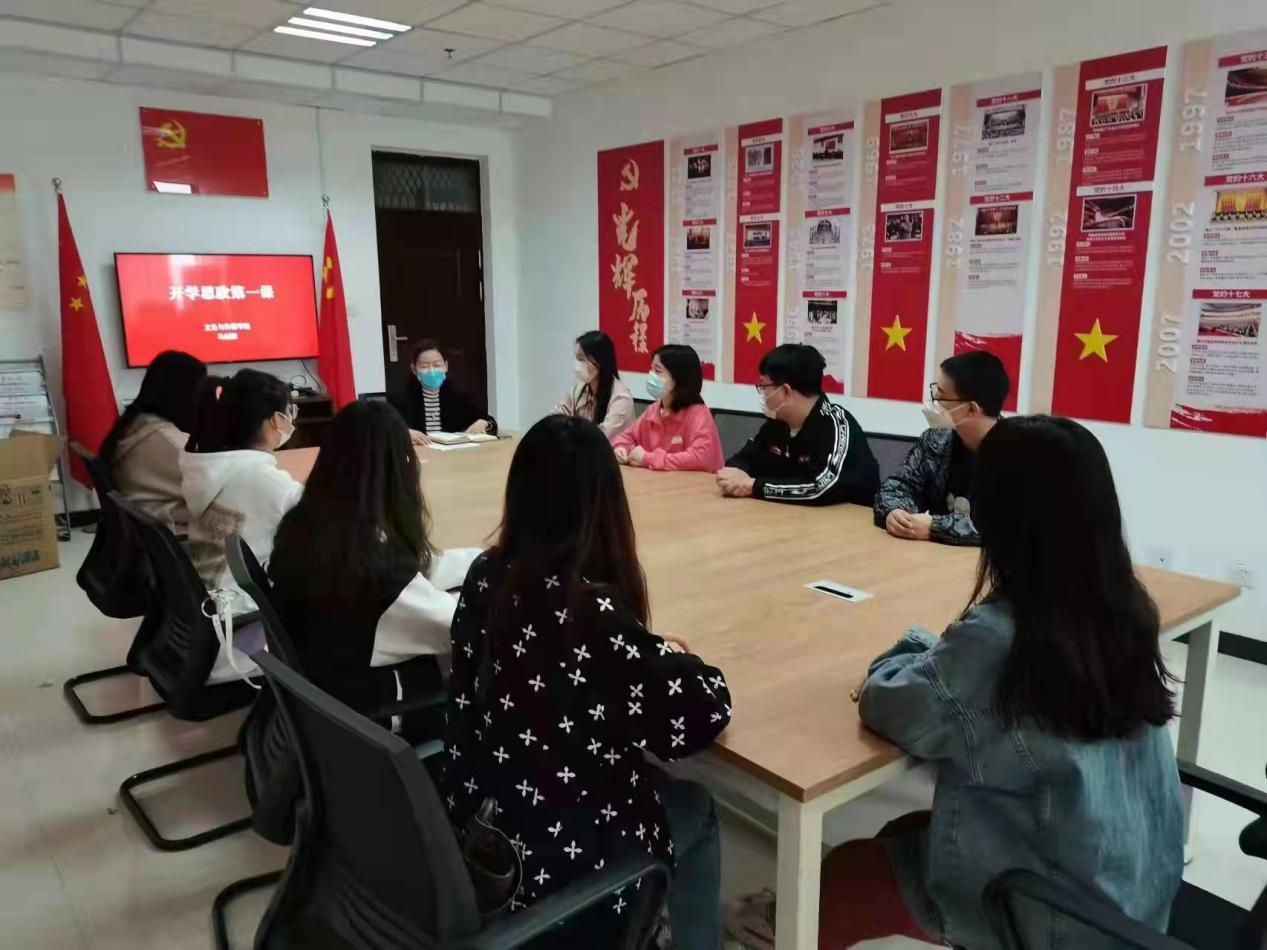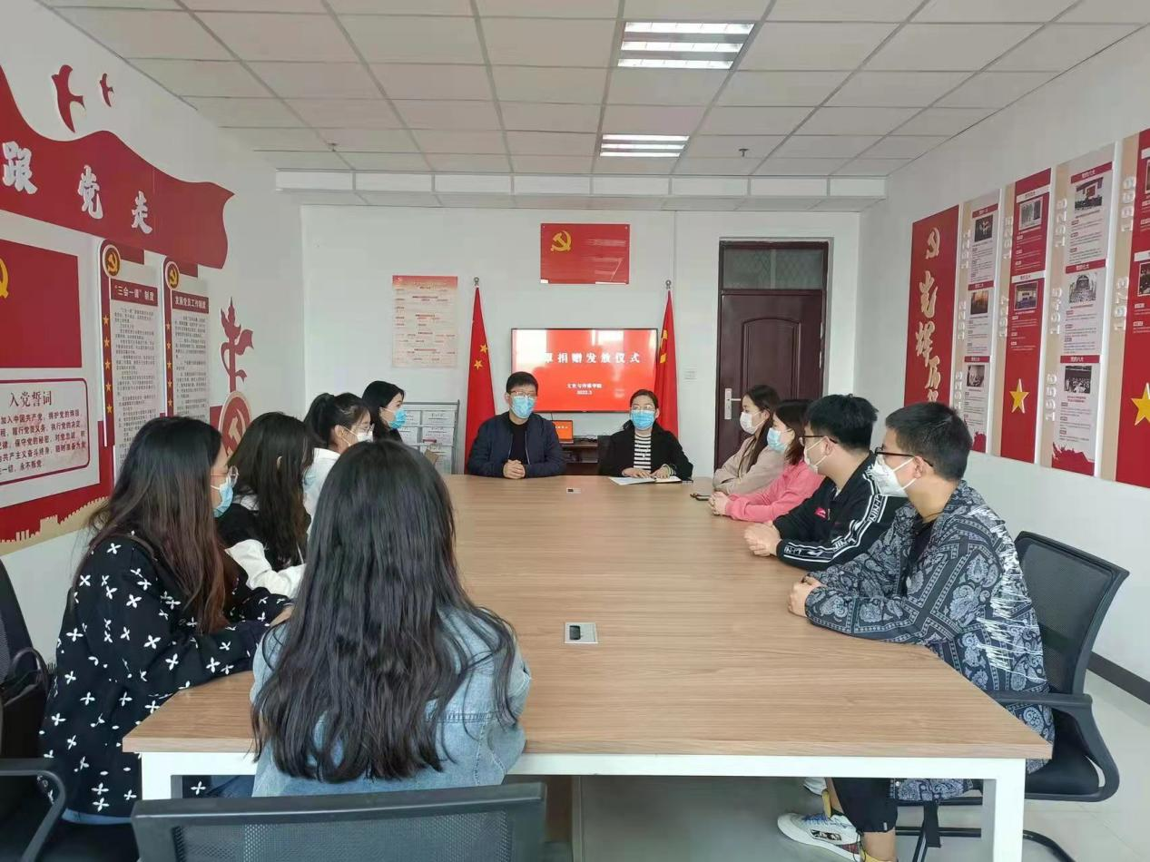3月10日下午,我院在文综楼1509举行了爱心口罩捐赠发放仪式暨开学思政第一课。我院党委副书记马丽娜、团委书记訾冉和部分学生代表参加会议。