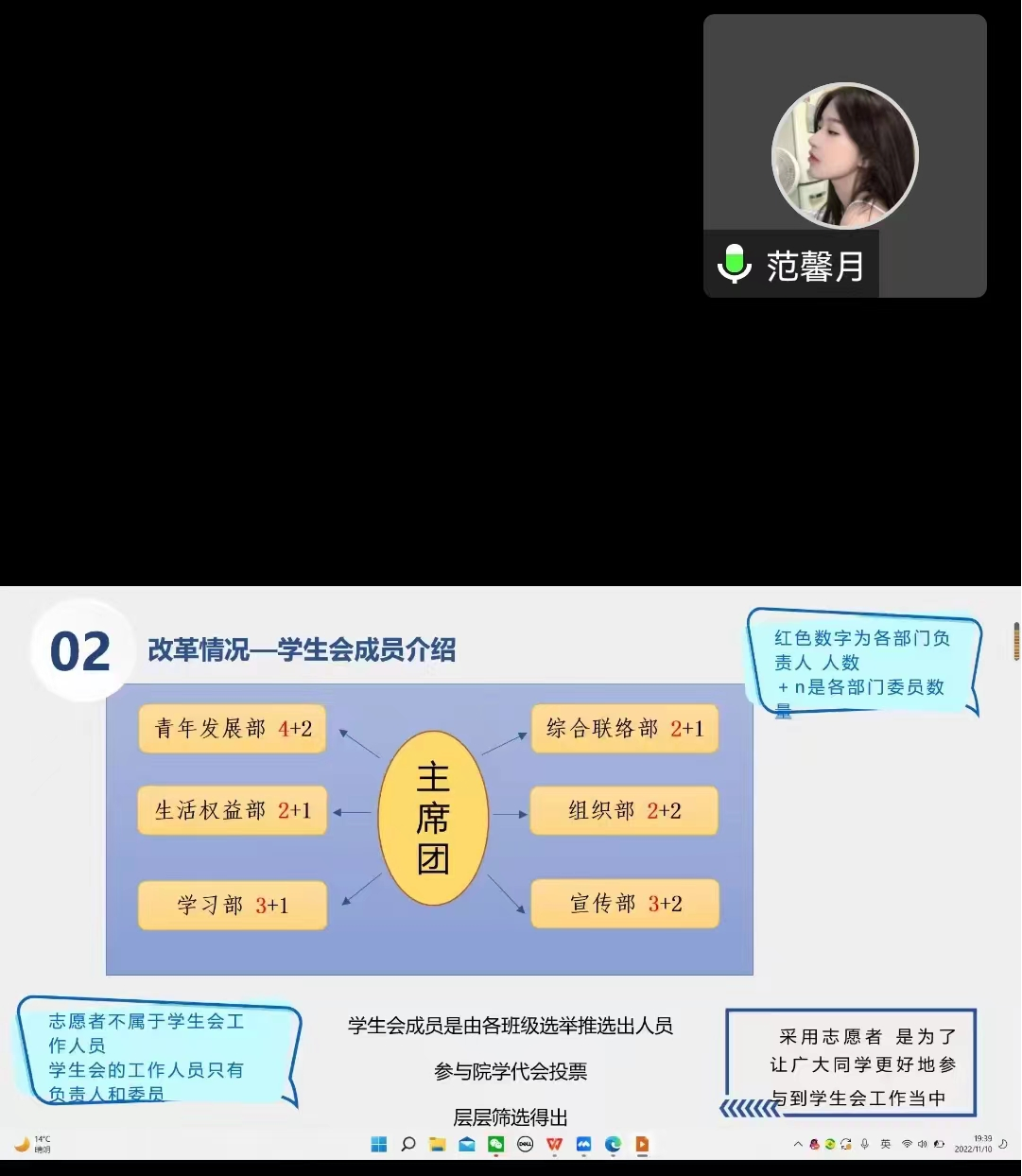 11月10日下午,我院在线上召开2022届学生会工作培训会议,我院学生会执行主席范馨月主持会议,学生会全体成员参加会议。
