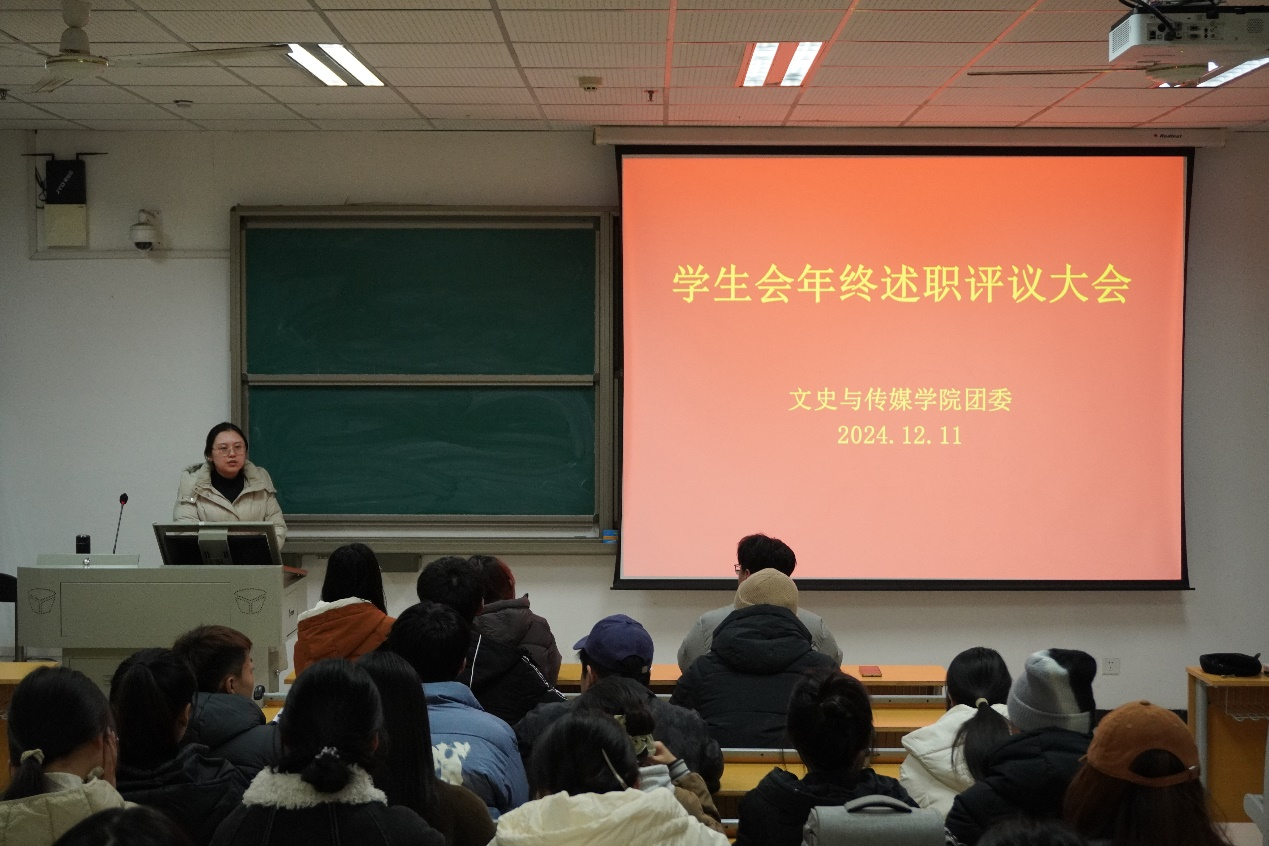 为进一步提升我院学生干部的工作能力,使学生会工作科学化、制度化、规范化,2024年12月11日至13日,我院在文综楼多媒体教室举行了学生会年终工作述职评议大会,我院团委书记张姗姗老师、校学生会主席团代表和全体学生会成员参与此次会议。