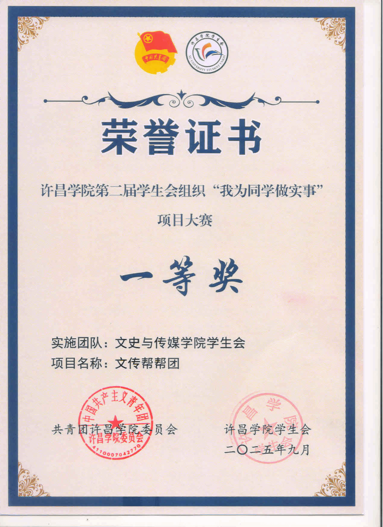 近期,在我校举办的“我为同学做实事”项目大赛中,我院“文传生活帮帮团”项目凭借其精准的服务定位、创新的运行机制与扎实的落地成效,从众多参赛项目中脱颖而出,荣获大赛一等奖。