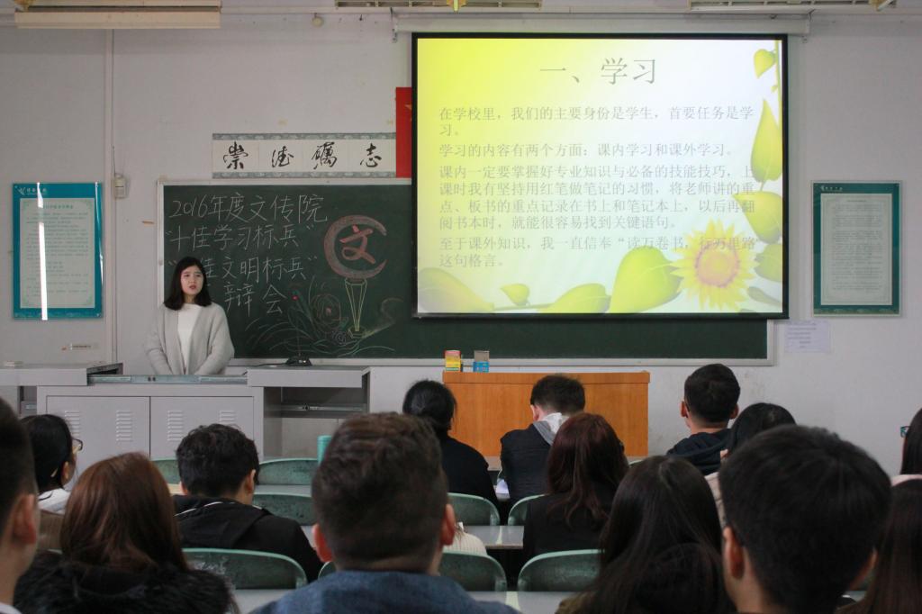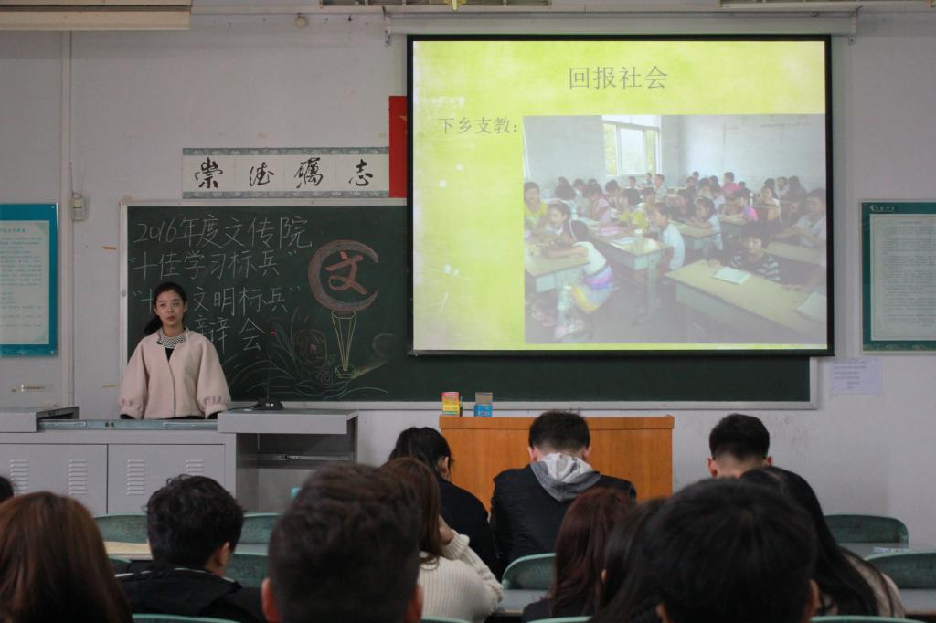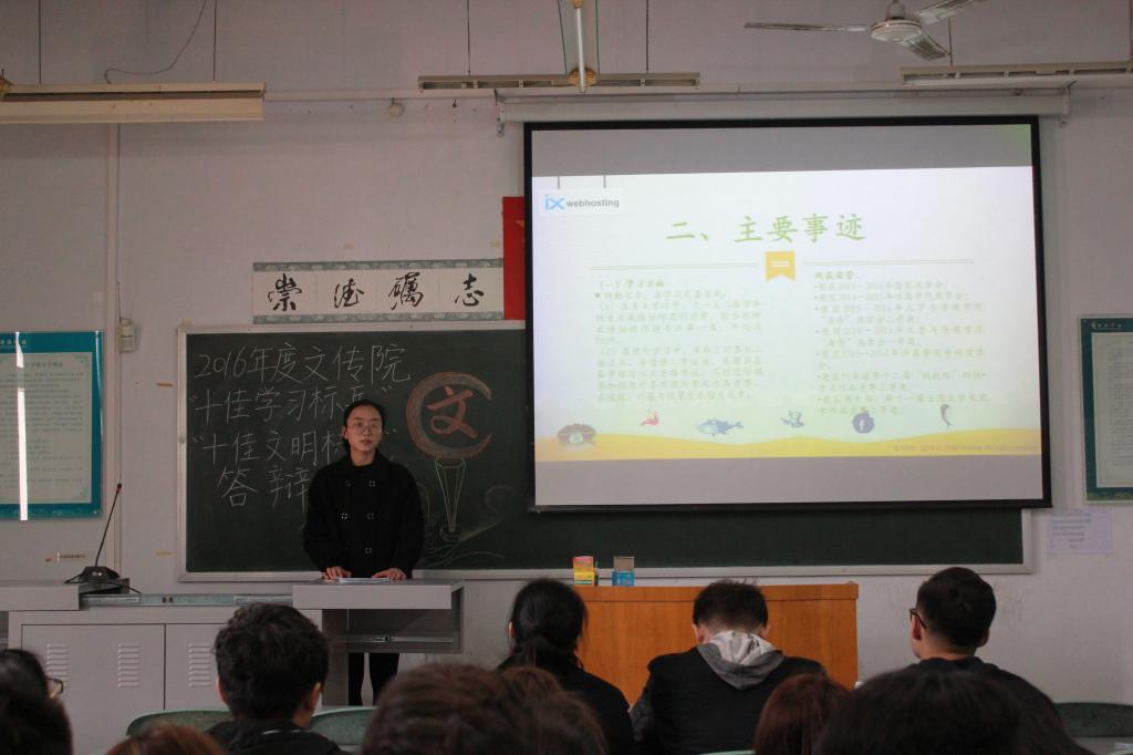 会上,答辩选手依次抽签,确定出场顺序。在答辩环节中,选手们结合个人ppt展示,围绕学习方法、个人荣誉、社会文明实践等方面对过去的大学生活进行陈述。多数候选人身兼数职仍热心为同学服务,心怀感恩并积极参加社会公益活动,在努力提升综合素质的同时加强道德文明修养。他们用实际行动向在场的同学证明了学习与文明同行。选手们精彩的答辩给同学们留下深刻的印象,本次答辩会取得圆满成功。