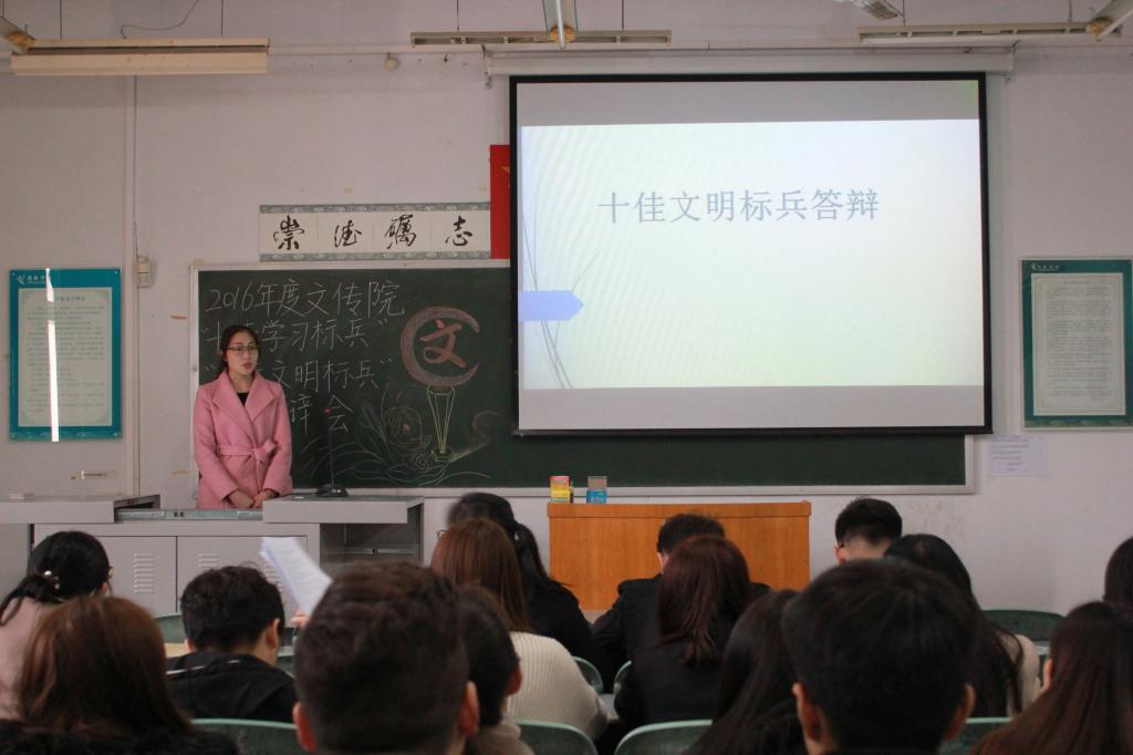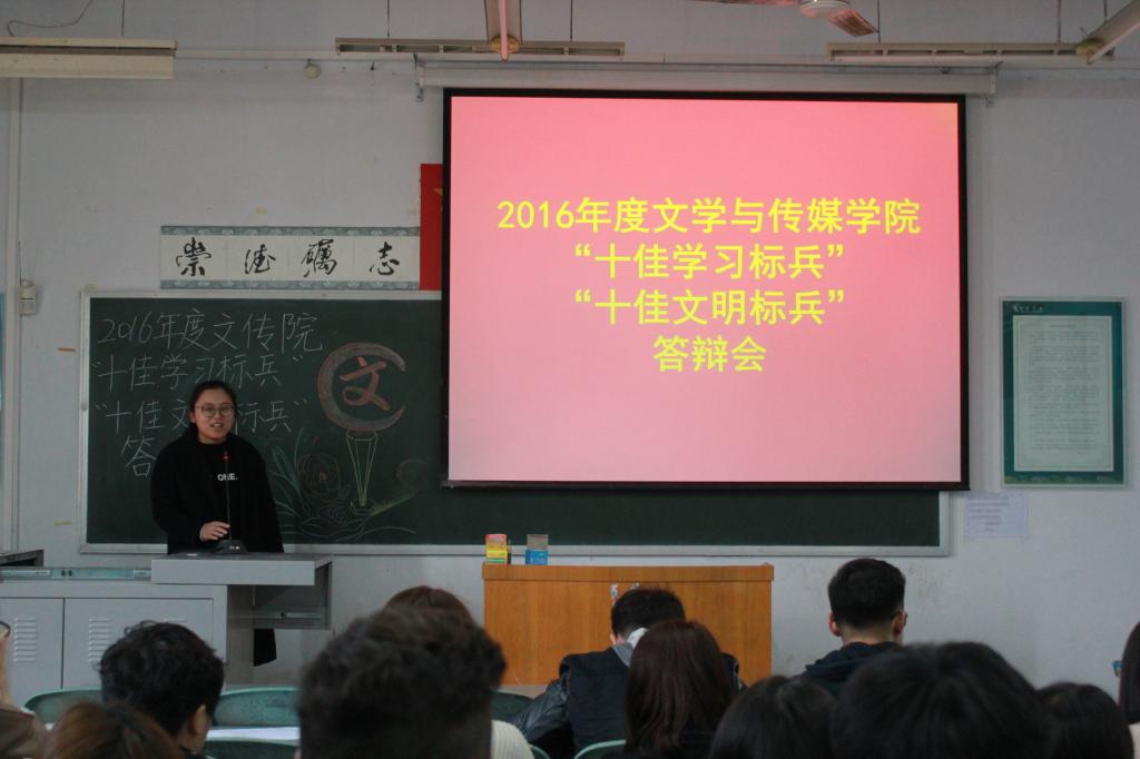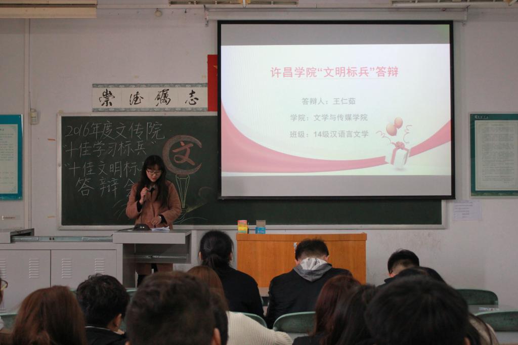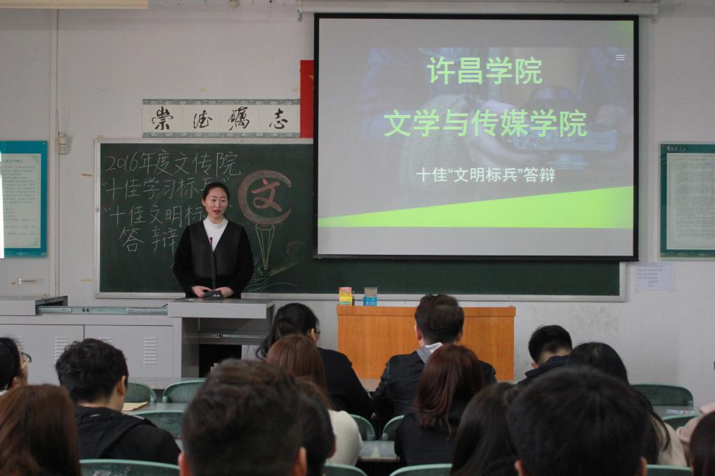 3月8日下午一点,文学与传媒学院在C--103教室举行了许昌学院文学与传媒学院2016年度“十佳学习标兵”、“十佳文明标兵”答辩会。我院辅导员张姗姗、张科、周驰程老师担任评委,2016届学生代表及6名候选人参与了本次答辩会,答辩会由张姗姗老师主持。