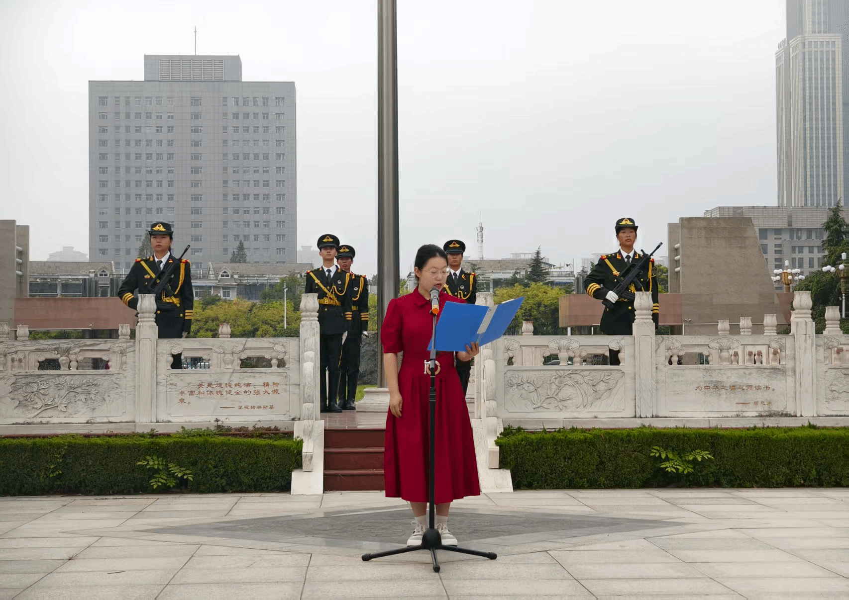 晨光熹微中,伴随着《义勇军进行曲》,五星红旗冉冉升起,迎风飘扬。全体师生以饱满的热情齐唱国歌。升旗礼毕,学生代表王柳以《铭记“九一八”,吾辈自当强》为主题进行国旗下的演讲,带领大家回顾了那段屈辱与抗争的历史,深切缅怀革命先驱,并呼吁全体同学要深刻铭记历史教训,珍惜和平,将爱国之情、强国之志转化为报国之行。