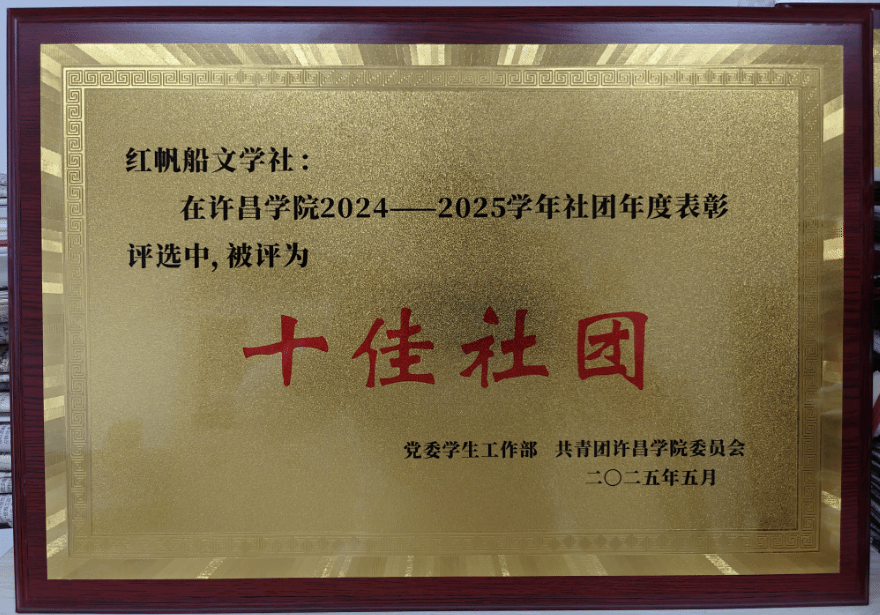 近日,我校开展社团2024-2025年度表彰评选,文史与传媒学院红帆船文学社凭借深厚的文学底蕴、丰富的社团活动与广泛的校园影响力,荣获“十佳社团”荣誉称号。