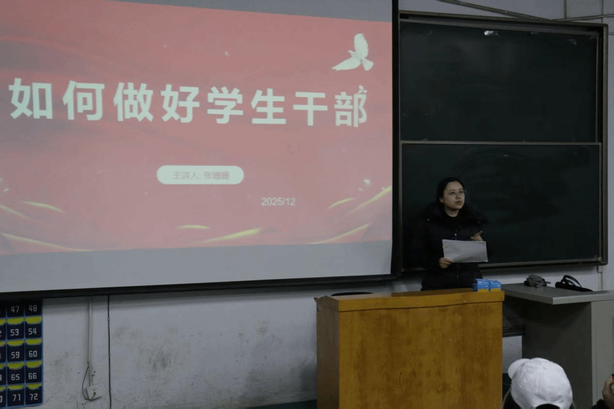 首场培训以“如何做好学生干部”为主题,主讲人张姗姗老师从思想引领、责任担当、品德涵养等多角度进行系统阐述。她指出,学生骨干要筑牢思想根基,锤炼实干作风,坚守服务初心,严于律己修身,努力成长为政治坚定、能力突出、同学信赖的骨干力量。