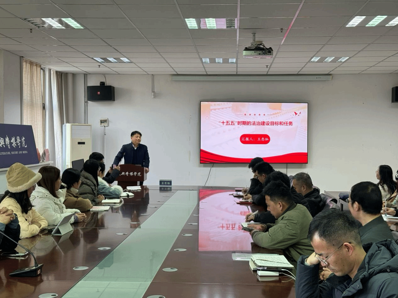 2026年1月9日下午,学校党的二十届四中全会精神宣讲团成员、法学院院长王忠灿在文综楼1723会议室,为我院教师党员代表作题为《“十五五”时期的法治建设目标和任务》的专题宣讲。宣讲会围绕党的二十届四中全会关于法治中国建设的最新部署,结合“十四五”法治建设成就,系统阐释了“十五五”时期法治一体建设的路径与方向。