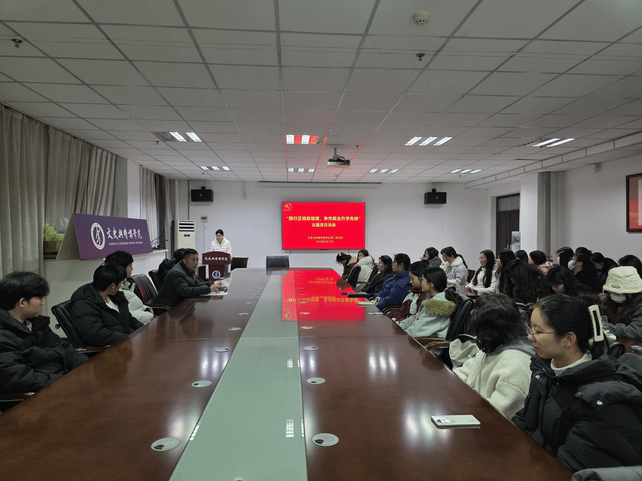 3月17日,文史与传媒学院学生第二党支部在文综楼1723会议室开展“践行正确政绩观,争做就业升学先锋”主题党日活动。支部全体党员、发展对象、入党积极分子及2026届历史学专业毕业生代表参加活动。