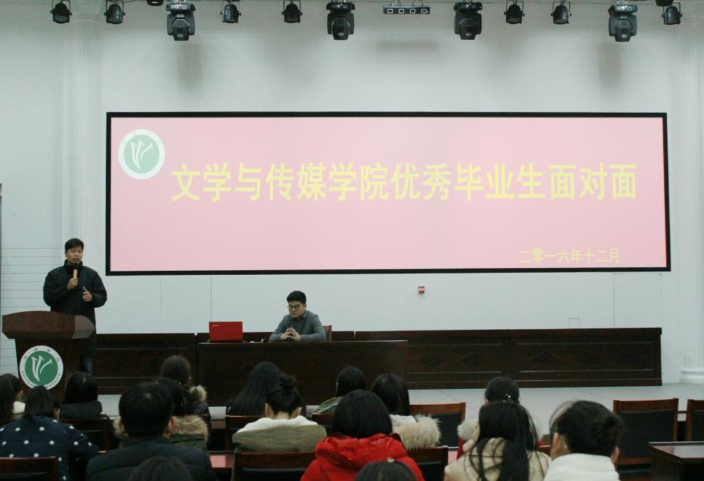 12月26日下午三点半,文学与传媒学院在创新创业学院一楼培训中心举办了优秀毕业生交流会。此次交流会由我院党总支副书记李立夏主持,邀请我院16届优秀毕业生、现就读于英国诺丁汉大学的赵津羽同学回到母校,与我院百名学生进行交流。