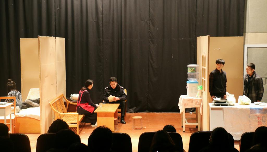 12月18日晚七点半,由文学与传媒学院编剧表演班主办的“家乡四则”话剧在B合七演播厅拉开帷幕。我院院长刘道全、指导老师张晶晶和热爱话剧的同学共同观看了本次演出。