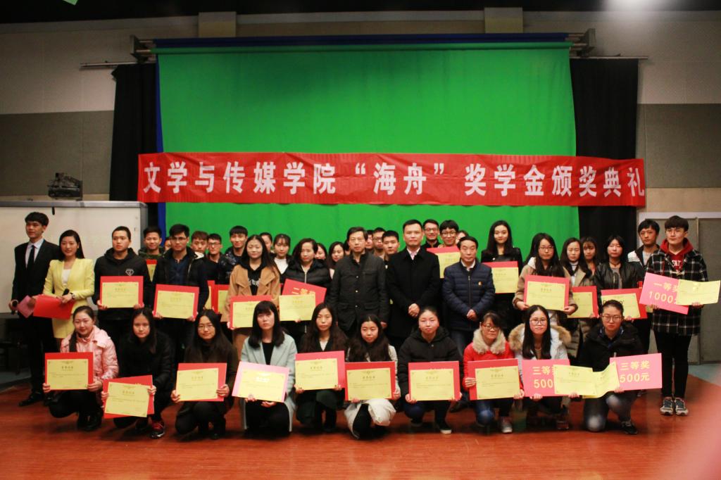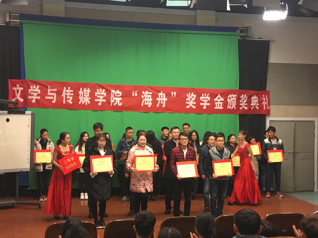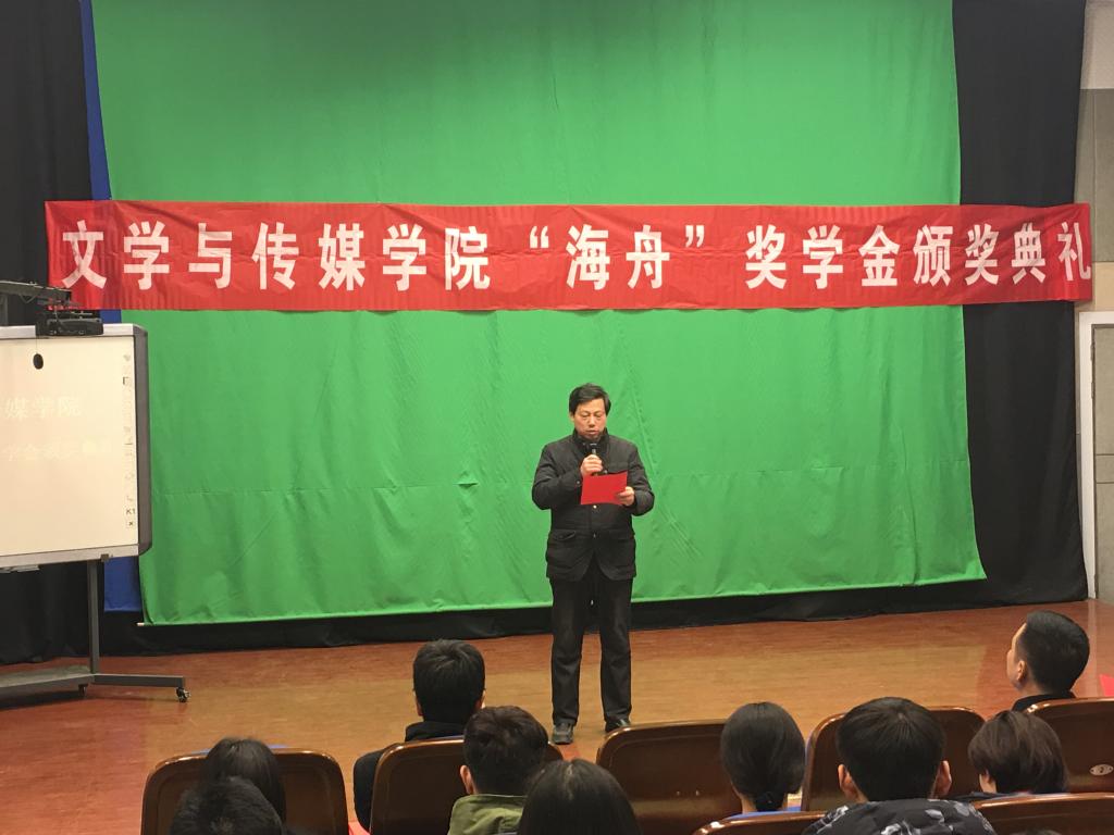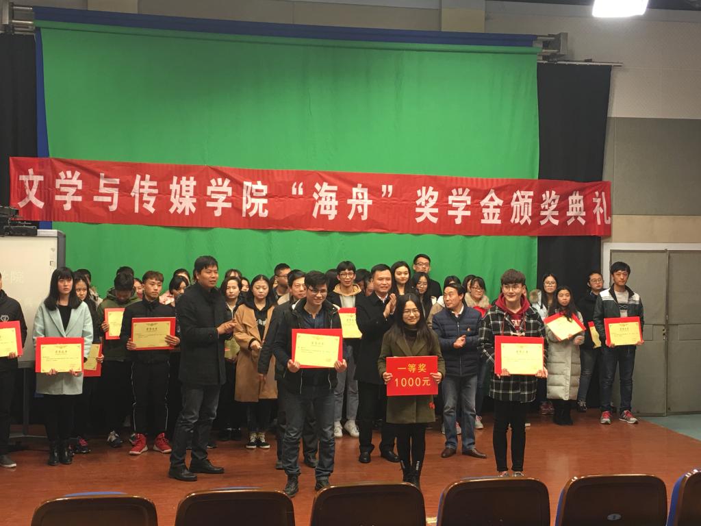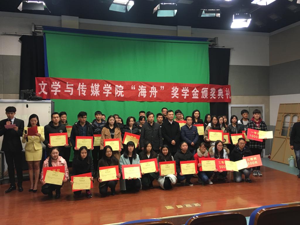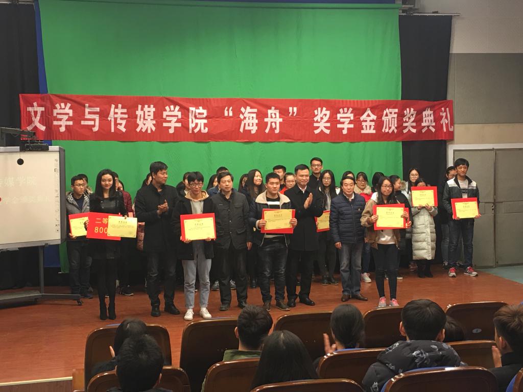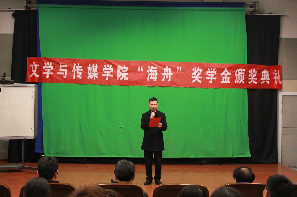 12月9日下午,文学与传媒学院在B合七演播厅举行2016年第五届“海舟”奖学金颁奖典礼。校学生处处长张鹏辉、我院党总支书记赵颖、院长刘道全、党总支书副记李立夏莅临现场。受表彰学生、各班级负责人以及部分学生代表参与了本次颁奖典礼。