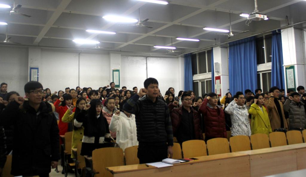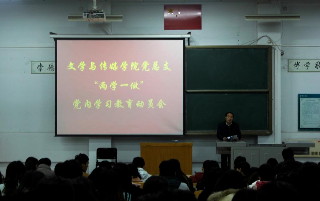 为积极贯彻落实中共中央办公厅印发的《关于全体党员中开展“学党章党规、学系列讲话,做合格党员”学习教育(以下简称“两学一做”学习教育)方案》的精神要求,落实校党委组织部工作部署,深入推进“两学一做”学习教育,3月8日晚七点,文学与传媒学院党总支在A合九教室召开了“两学一做”党内学习教育动员大会。院党总支书记赵颖、教师党员代表、全体辅导员及学生党员共140多人参加了动员大会,动员大会由院党总支副书记李立夏主持。