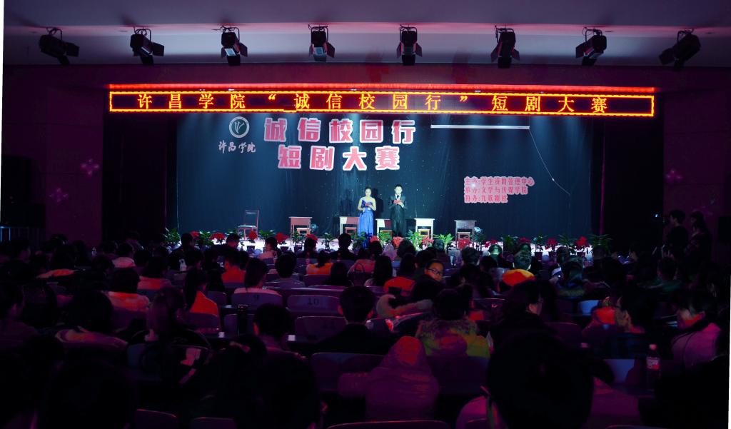 为进一步宣传国家助学政策,使诚信观念深入人心。12月10日下午,由许昌学院学生资助管理中心主办、文学与传媒学院承办、九哥剧社协办的许昌学院“诚信校园行”短剧大赛在大学生活动中心拉开帷幕。许昌学院学生工作处处长、学生资助管理中心主任张鹏辉,许昌学院团委副书记谢依楠以及各院系党总支书记、副书记莅临本次大赛。我校百余名学生共同观看了这场诚信盛宴。
