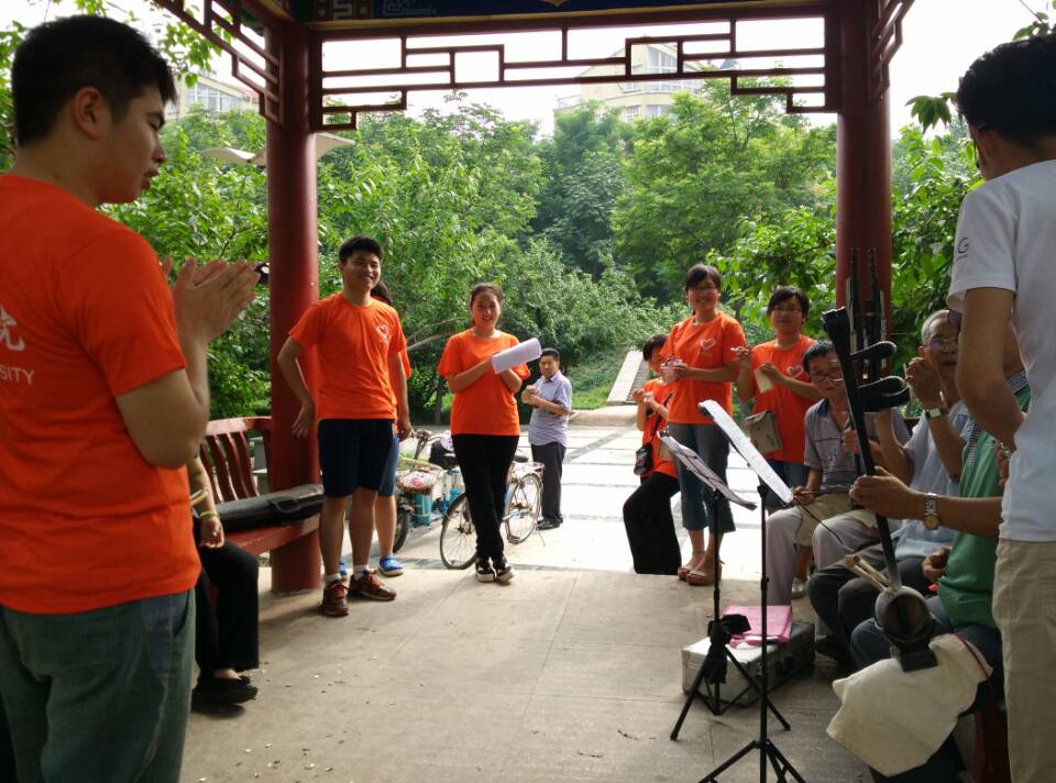 戏迷前辈们首先介绍了豫剧的发展、豫剧伴奏所需的基本乐器及豫剧的基本板式等。随后,在乐队老师的配乐下,队员们先后演唱了《秦雪梅》、《穆桂英挂帅》、《大登殿》等豫剧经典选段,吸引了众多游人前来观看。期间,前辈们与队员们就豫剧的学习与演唱进行了深入交流。在交流中,队员们对豫剧有了更加进一步的了解。最后,前辈们对队员们本次开展的活动给予肯定,并鼓励队员们再接再励,希望在戏曲发展道路上为同学们提供更多的支持与帮助。