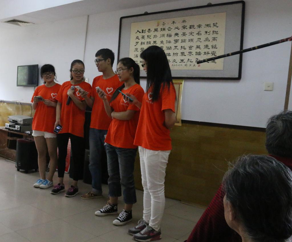 早上八九点,志愿服务队在相关负责人的组织下乘车抵达绿园敬老院。在队长孙青龙的带领下,队员们开始分组,进行卫生打扫和场地布置,为下午的表演做好准备工作。下午三点整,老人们来到了福寿堂观看志愿者们的表演。队员们为老人表演了生动有趣的节目,有乐观积极的红歌演唱、慷慨激昂的诗歌朗诵、队员们与老人互动的健身操等,使得全场氛围高涨,赢得老人的热烈掌声。其中,队员王一鸣为老人们带来了他精心准备的吉他弹奏——《光辉岁月》,饱含深情的唱词将现场气氛带向高潮,老人们纷纷拍掌为他打节奏。节目最后,队员们与老一辈的党员们共同合唱《团结就是力量》,以此迎接即将到来的党的生日,并对祖国的未来献上自己的祝愿,现场气氛一片欢腾。