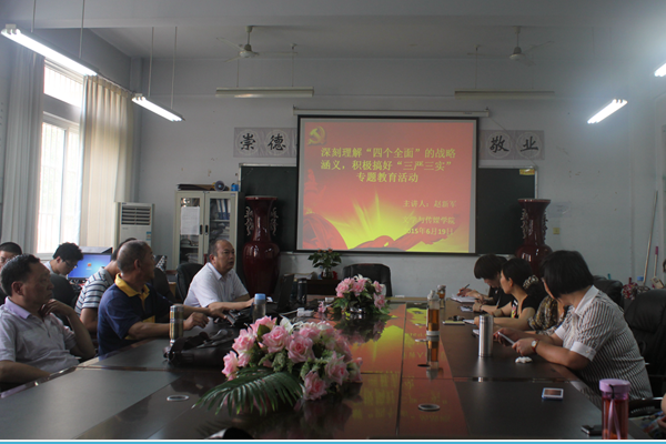 6月19日下午两点半,文学与传媒学院在A3二楼会议室组织召开了深刻理解“四个全面”的战略涵义,积极搞好“三严三实”专题教育活动的专题学习研讨会。文学与传媒学院党总支书记赵新军担任本次研讨会主讲。文传院全体教职工参加了本次研讨会。