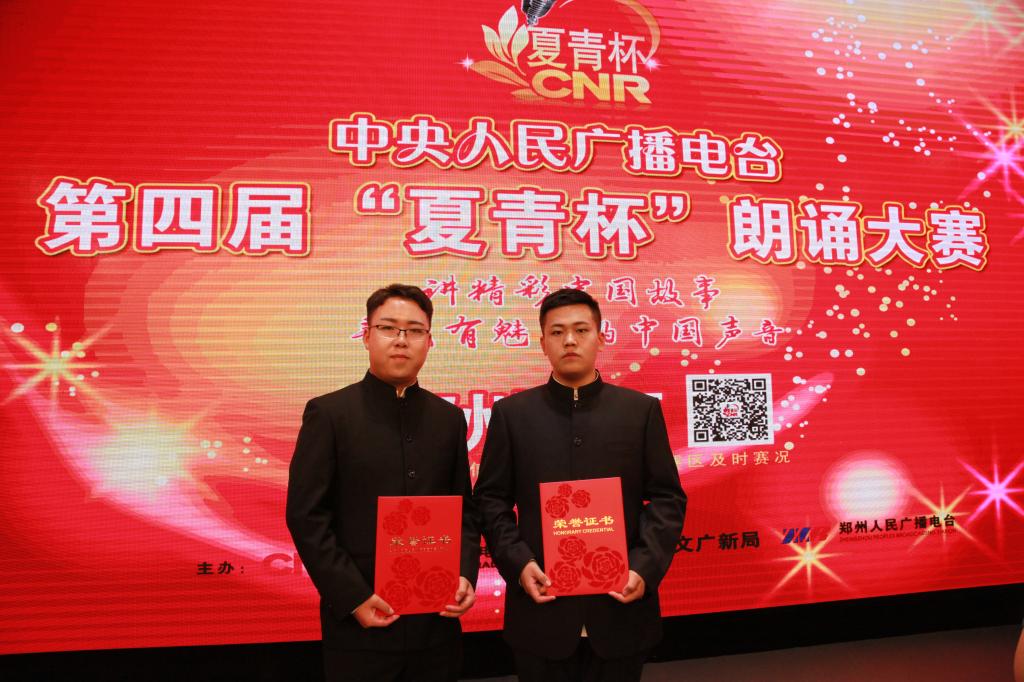 6月25日,我院2013级播音与主持艺术专业学生尤兴、牛善耕在中央人民广播电台第四届“夏青杯”全国朗诵大赛郑州赛区决赛中荣获优秀奖。