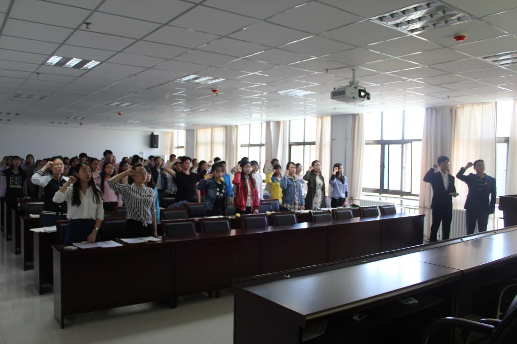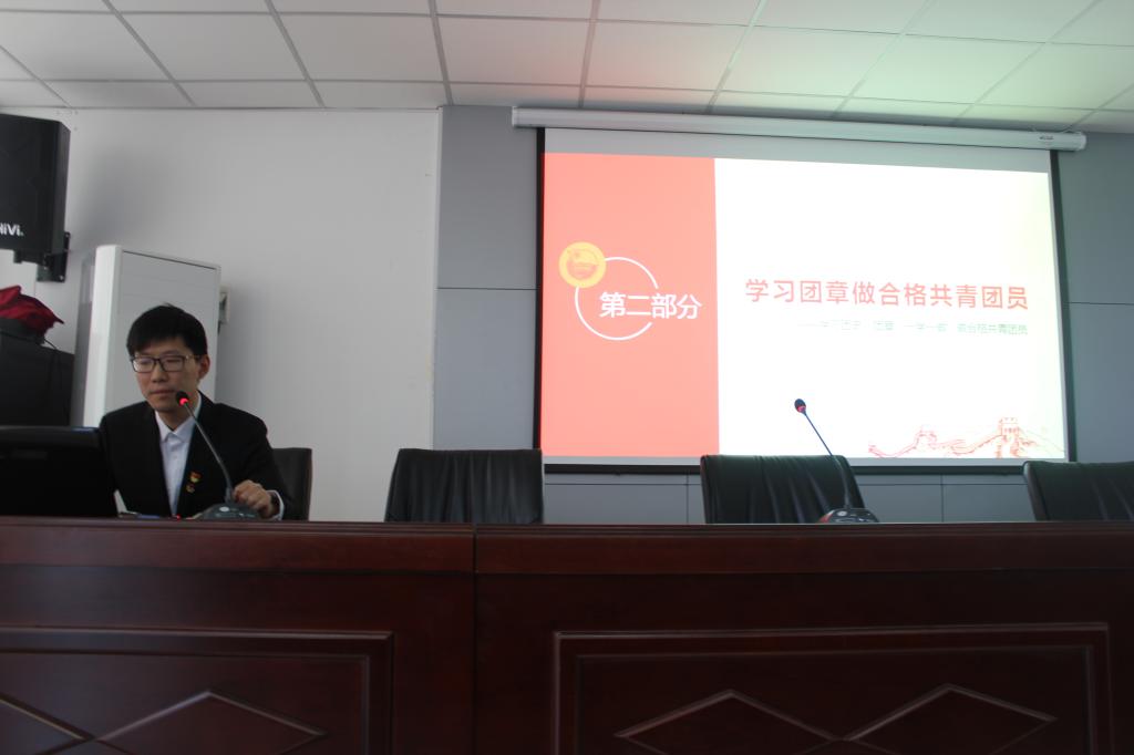 訾冉老师分别从中国共青团的发展历程、中国共青团团章的相关要求、“一学一做”教育实践活动、怎样做一名合格团员等方面,给大家做了一次深入的思想引领。訾冉老师强调合格共青团员不仅在思想、品行方面严格要求自己,更是要知行合一,坚定共产主义远大理想和中国特色社会主义共同理想,牢固树立政治意识、大局意识、核心意识、看齐意识,做合格共青团员,在实现中国梦的实践中放飞青春梦想。最后,全体团员在訾冉老师的带领下重温入团誓词,铿锵有力的誓词激励振奋着每位共青团员,掷地有声的宣誓声展现了共青团员积极进取的精神风貌。