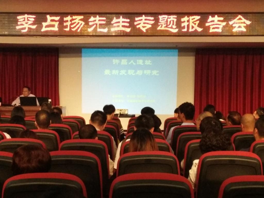 交接及授奖仪式上,许昌市对李占扬先生的研究成果进行表彰,并授予李先生“荣誉市民”称号。许昌市委宣传部部长王登喜先生上台致辞,感念为许昌市文化产业做贡献的良好市民。随后,我院师生跟随李占扬先生一行人参观“许昌人”头骨模型并聆听李先生讲解,受益匪浅。之后,我院师生与其他观众进入博物馆报告厅听取李占扬先生的专场报告会。报告会上,李先生向大家详细介绍了“许昌人”遗址的发现与研究,与观众分享了个人考古经历,展示了形态各异的头骨化石模型,详细回答了同学们提出的问题。