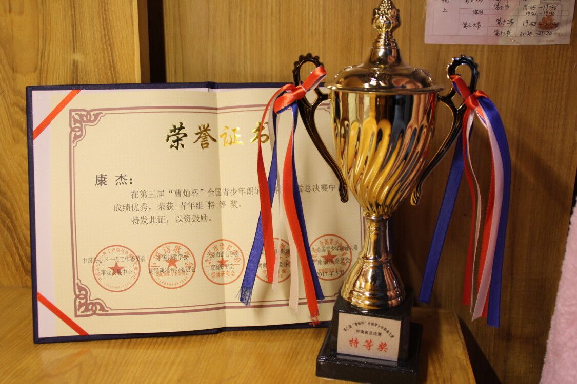 本次总决赛有64个赛区、124个分赛区的700名选手参赛。我校康杰同学经过层层角逐,在初赛和复赛中分别获得洛阳赛区二等奖和河南总赛区特等奖,顺利晋级全国总决赛。最终凭借扎实的语言功底和沉着大方的台风,荣获“曹灿杯”全国总决赛铜奖,充分展现了我校学子积极向上的精神面貌和扎实的专业素养。