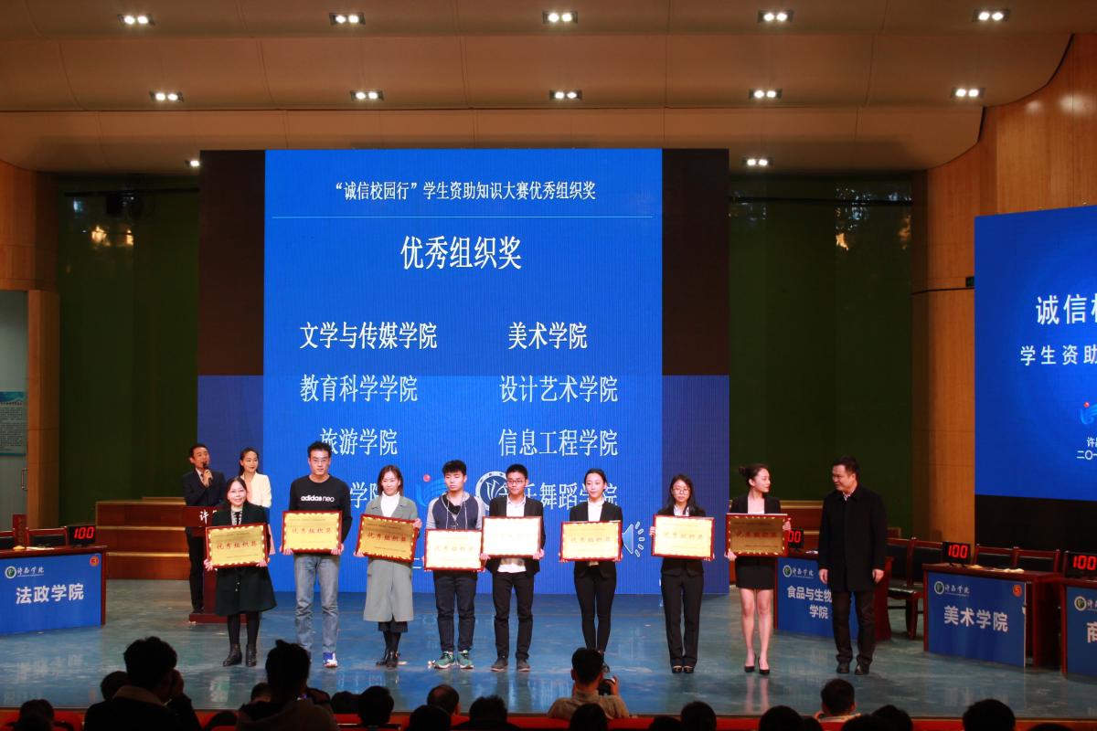 大赛结束后,张鹏辉处长上台发言,他指出讲诚信对构建和谐社会的重要意义,希望同学们都能成为讲诚信、懂感恩的人。紧接着,许昌学院校团委副书记史若延为“诚信校园行”资助征文大赛一等奖获得者颁发证书,副处长魏发展和奖助科马武为竞赛团体奖获学院颁发荣誉证书和奖金,张鹏辉处长为竞赛优秀组织奖获奖学院颁发证书,台下观众用热烈的掌声予以祝贺,大赛圆满落幕。