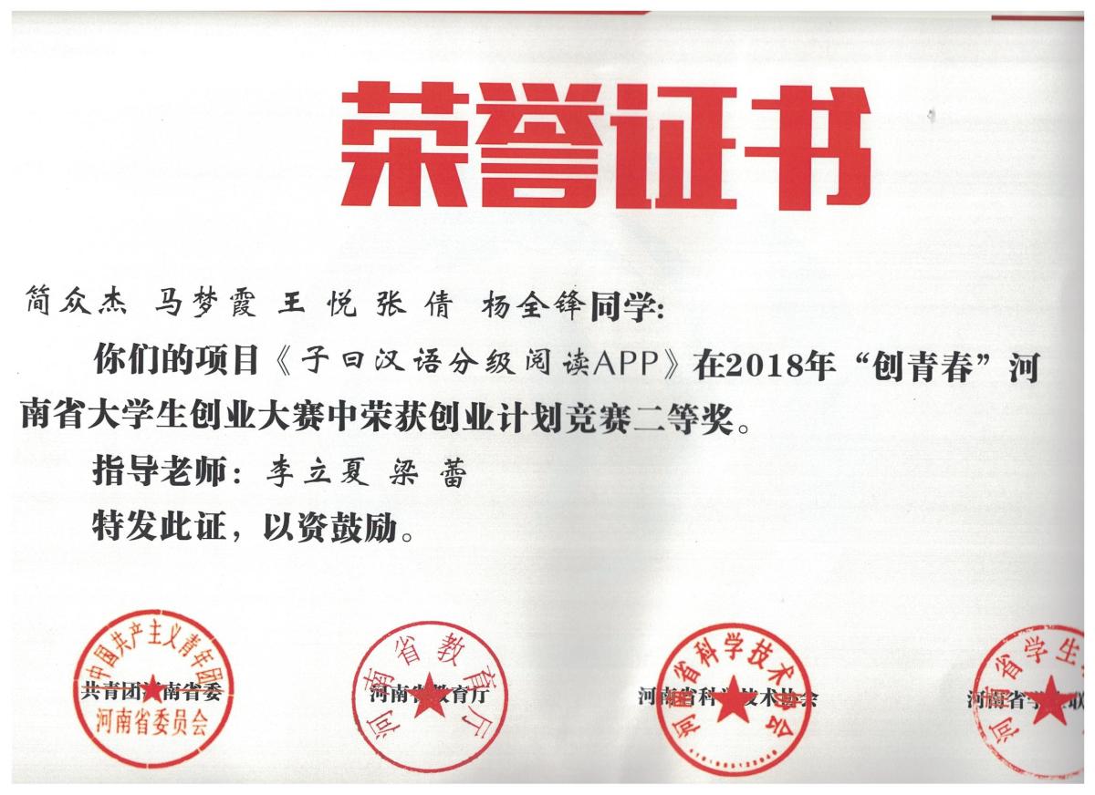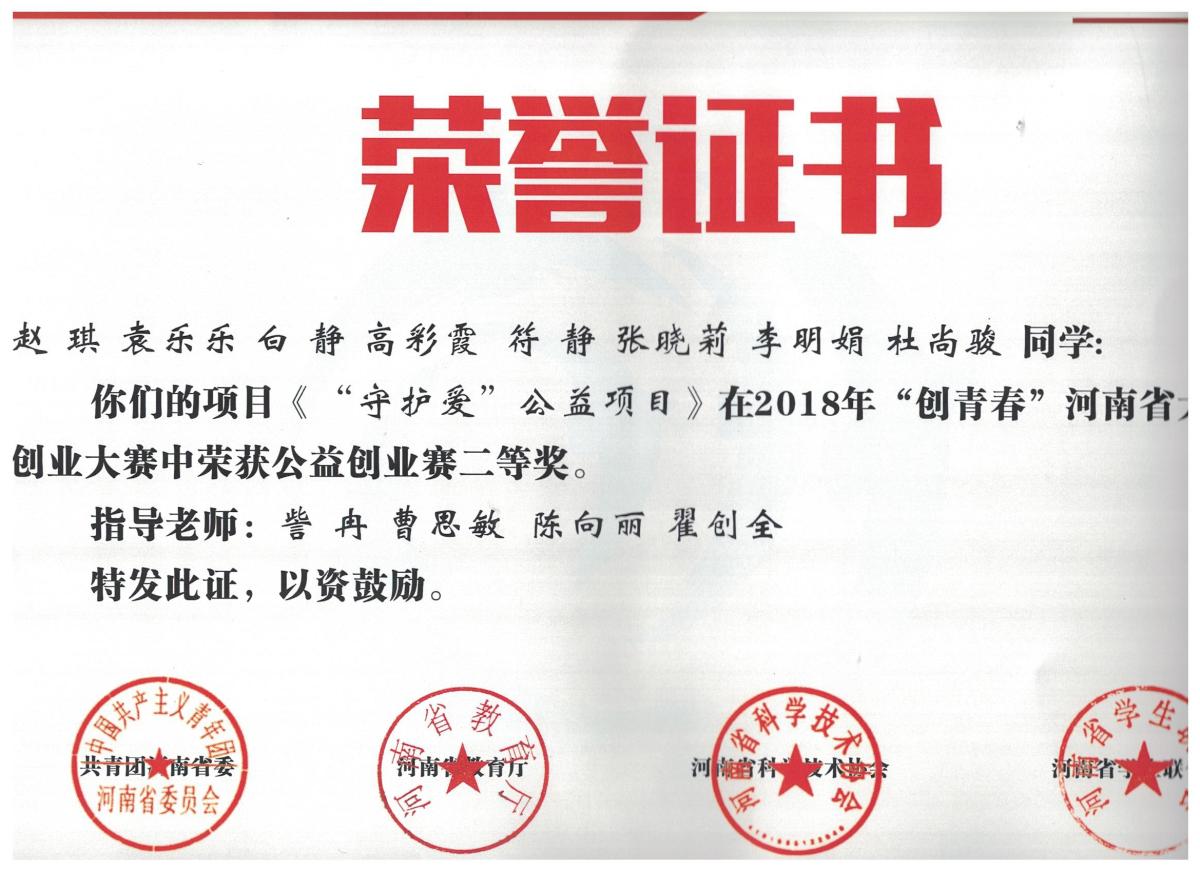 此次大赛自4月份启动以来,我院积极响应,多次组织老师对参赛队项目进行指导。最终,《“守护爱”公益项目》项目荣获“创青春”河南省创业大赛公益创业赛二等奖,《子曰汉语分级阅读APP》项目荣获“创青春”河南省创业大赛创业计划竞赛二等奖。