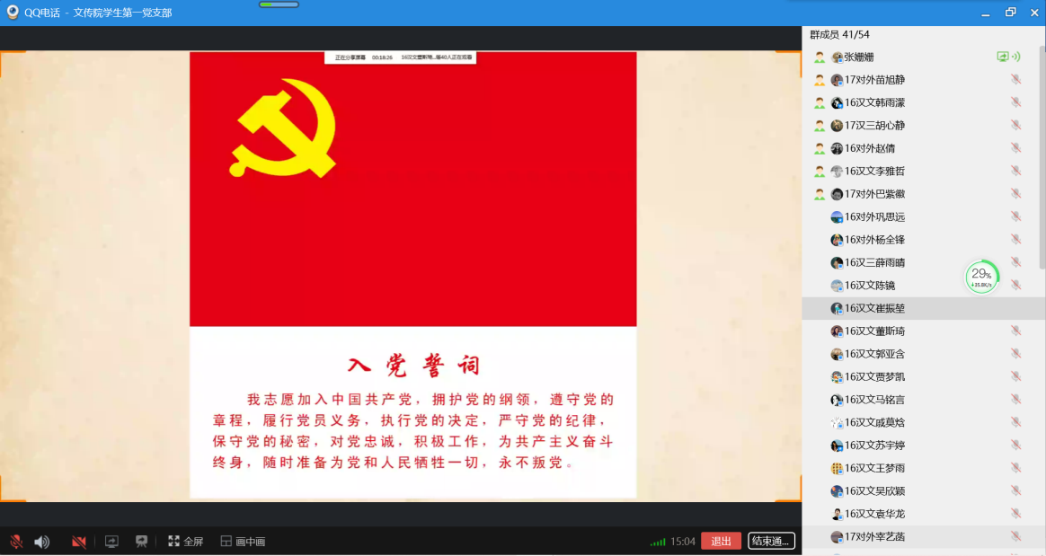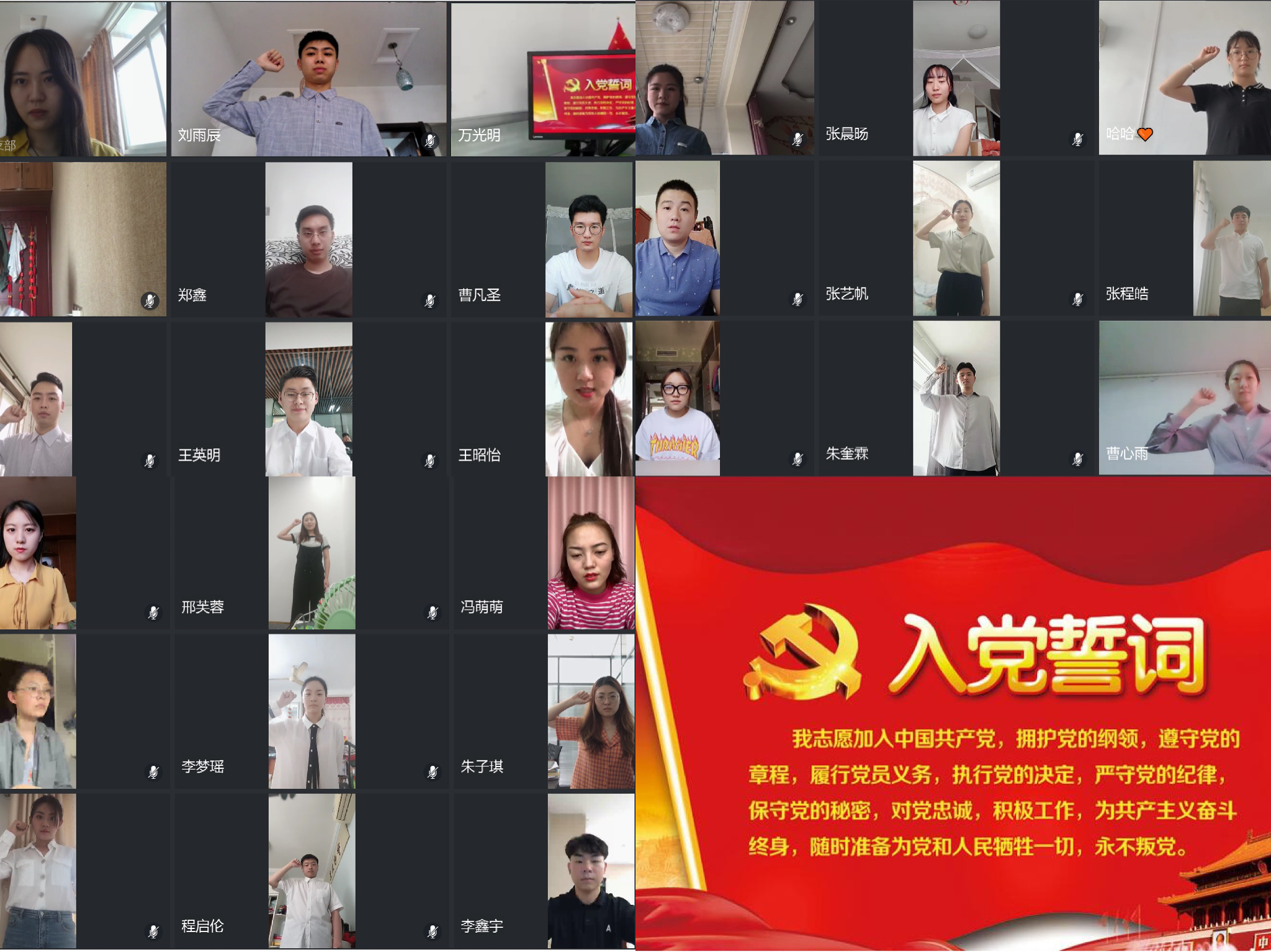 2020年6月6日下午,我院学生第一、第二和第三党支部通过网络分别召开上学期新吸纳预备党员的入党宣誓大会。本次会议由学生各党支部书记主持,学生第一、第二和第三党支部上学期新吸纳的34名预备党员同学参会。