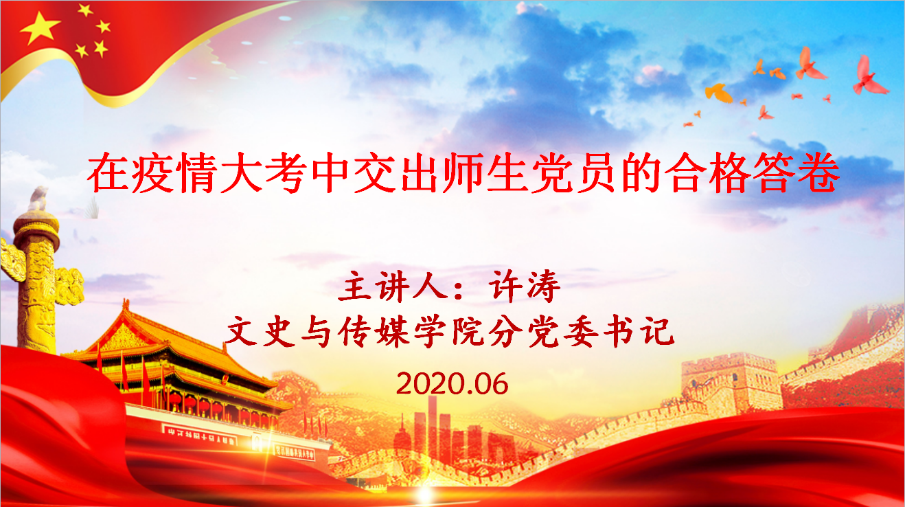 6月19日下午,我院党委书记许涛在文综楼1509会议室以《在疫情大考中交出师生党员的合格答卷》为题为教职工党员上党课。本次党课采取线上线下相结合的形式开展。