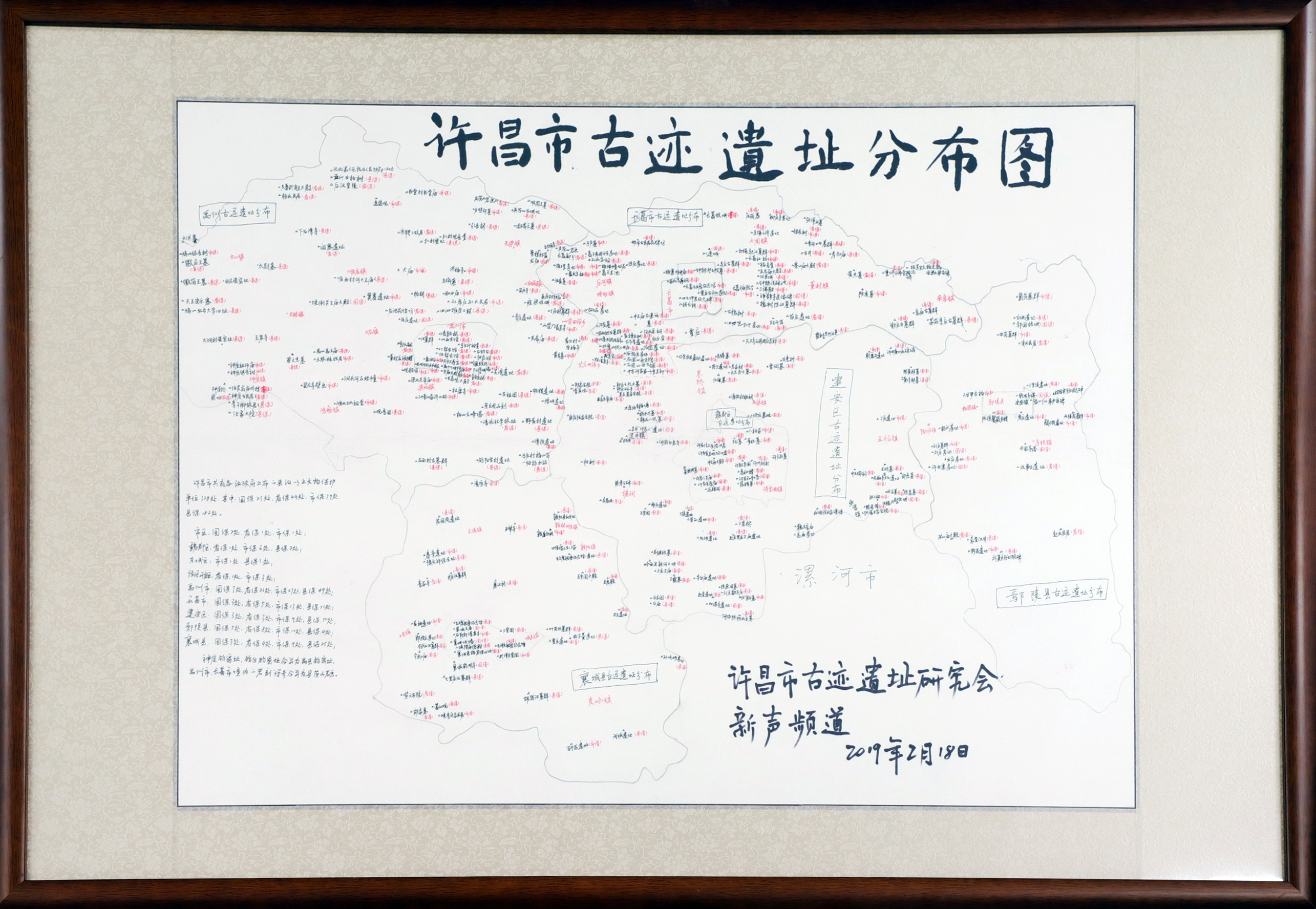“这些古迹遗址是许昌悠久历史的见证,我就想把许昌市有级别保护的古迹遗址手绘出来,为以后研究古迹遗址文化留点材料。”黄杰说,正是抱着这样的想法,他开始查阅大量资料,根据史料记载,走荒地、过田野,确定每个有级别保护的古迹遗址的地理位置,用时六年,手绘完成《许昌古迹遗址分布图》。