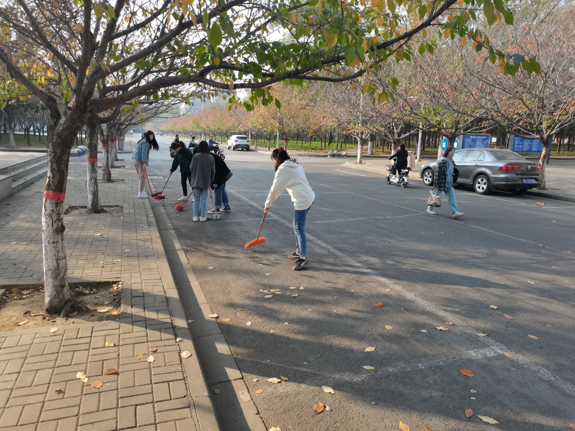 另一部分学员在校内协助环卫工人清理道路上堆积的落叶。秋意正浓,落叶纷纷,学校各处的主干道都铺上了一层落叶,给同学和老师们的日常上课出行带来了极大的不便。学员们在商讨过后分工合作,对堆积的树叶进行清扫处理,做到了真正为同学老师服务。